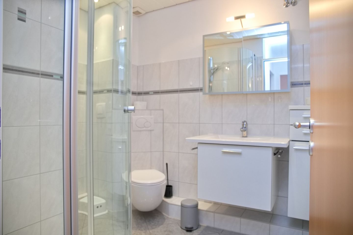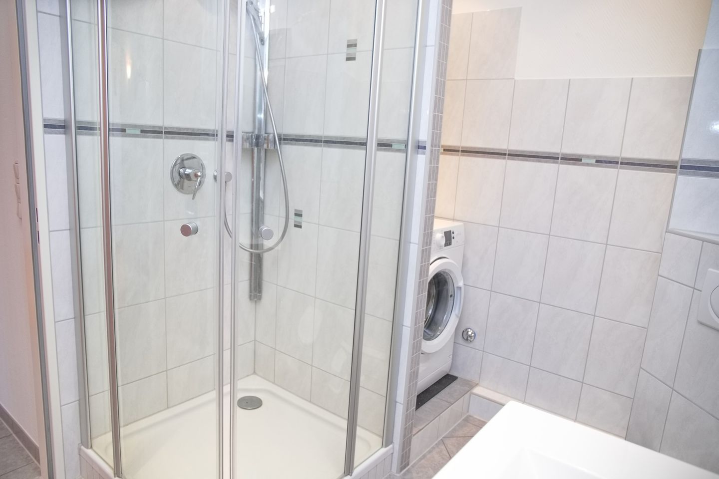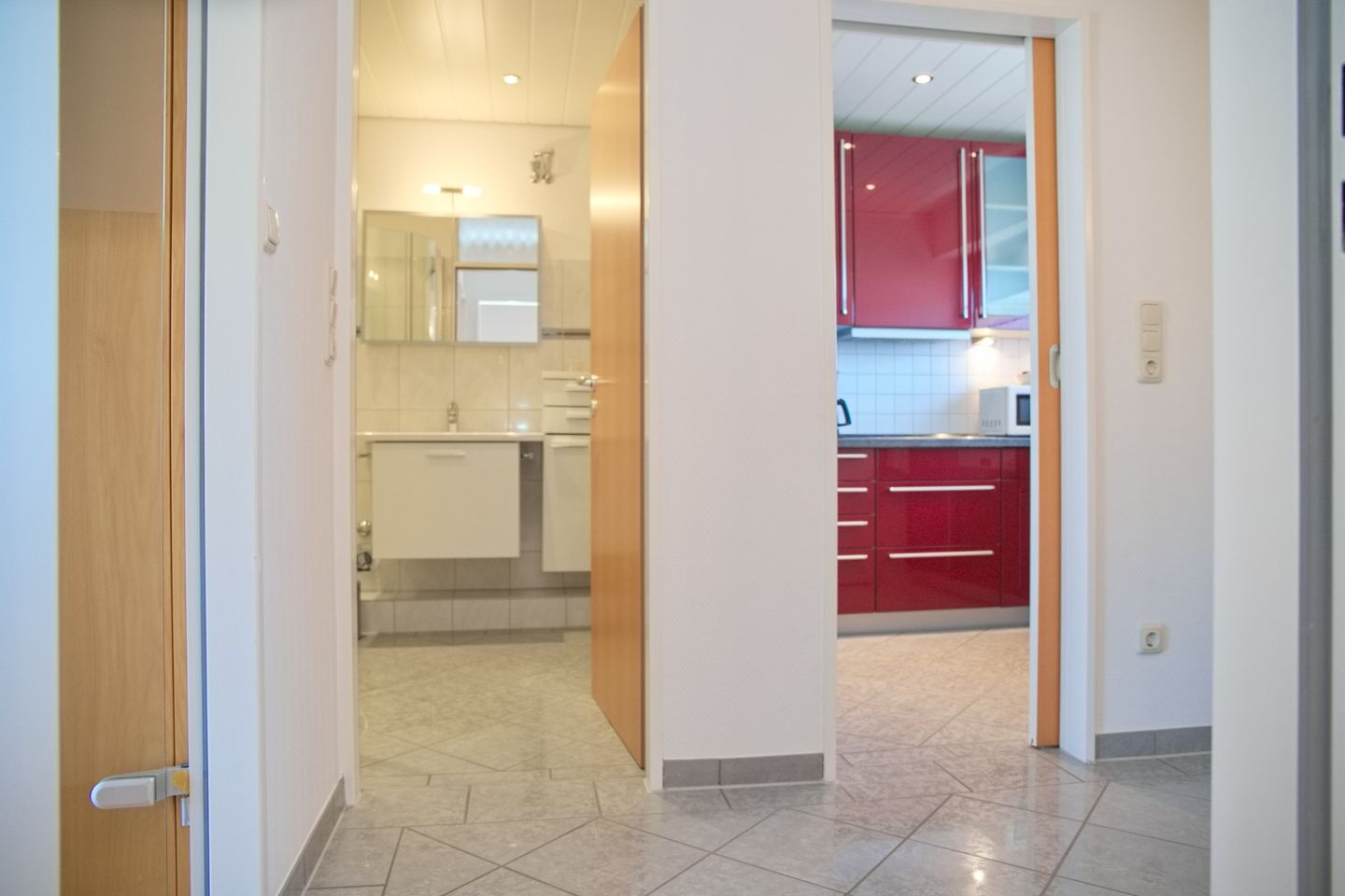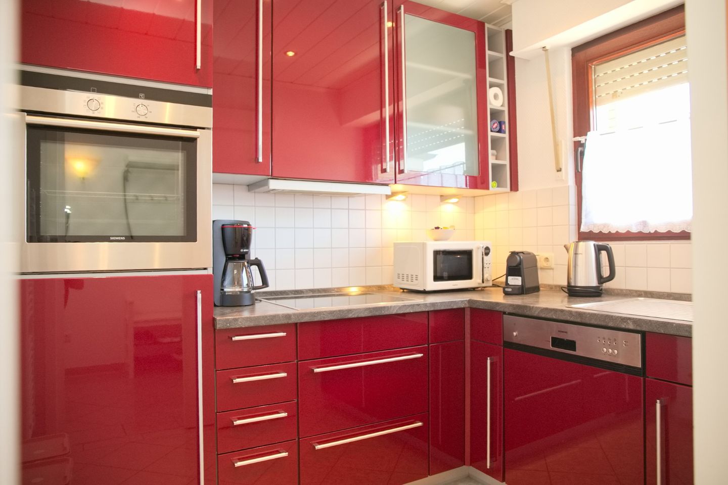 Die geschlossene Küche ist mit allen notwendigen Küchengeräten und -utensilien ausgestattet. Sie finden ein Cerankochfeld, einen Backofen, eine Mikrowelle sowie eine Spülmaschine vor – alles, was Sie benötigen, um kulinarische Köstlichkeiten zuzubereiten. Auch für die kleinen Snacks zwischendurch ist gesorgt: ein Kühlschrank mit Gefrierfach, ein Toaster und eine Kaffeemaschine stehen bereit. Ein Esstisch bietet genügend Platz für gemeinsame Mahlzeiten.