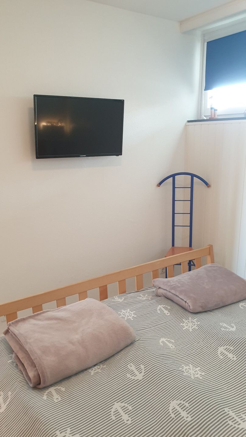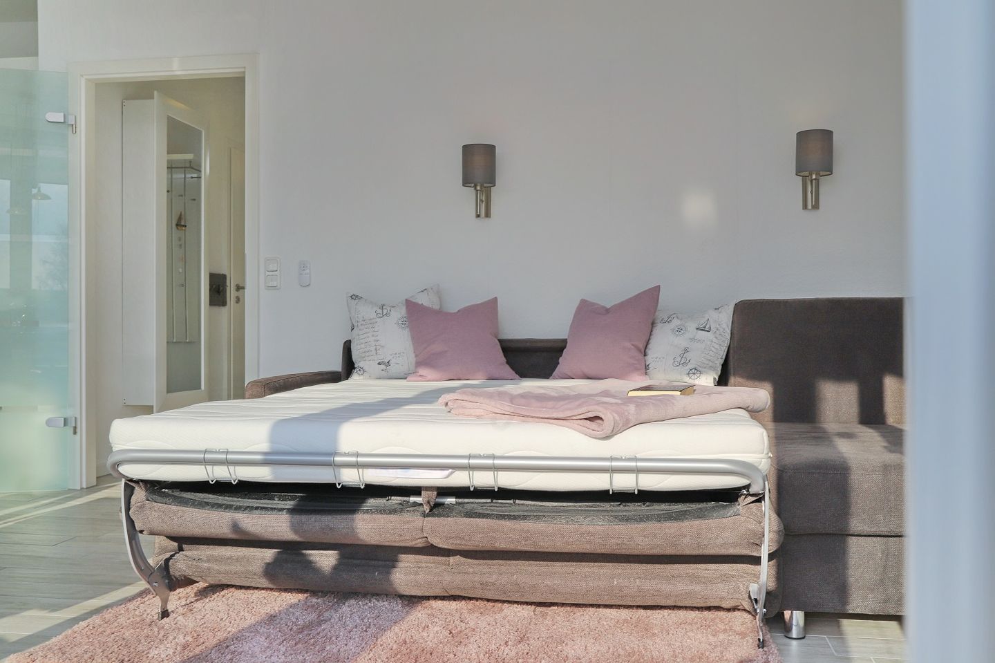 Sie finden des weiteren einen Schlafraum mit Doppelbett (2x 90x 200 cm) und TV sowie ein feines Wohlfühlbad mit Dusche mit kleiner, integrierter Sitzbank, WC sowie beheiztem Handtuchhalter vor. Die Schlafcouch im Wohnzimmer (155x200cm) bietet Platz für zwei weitere Personen.