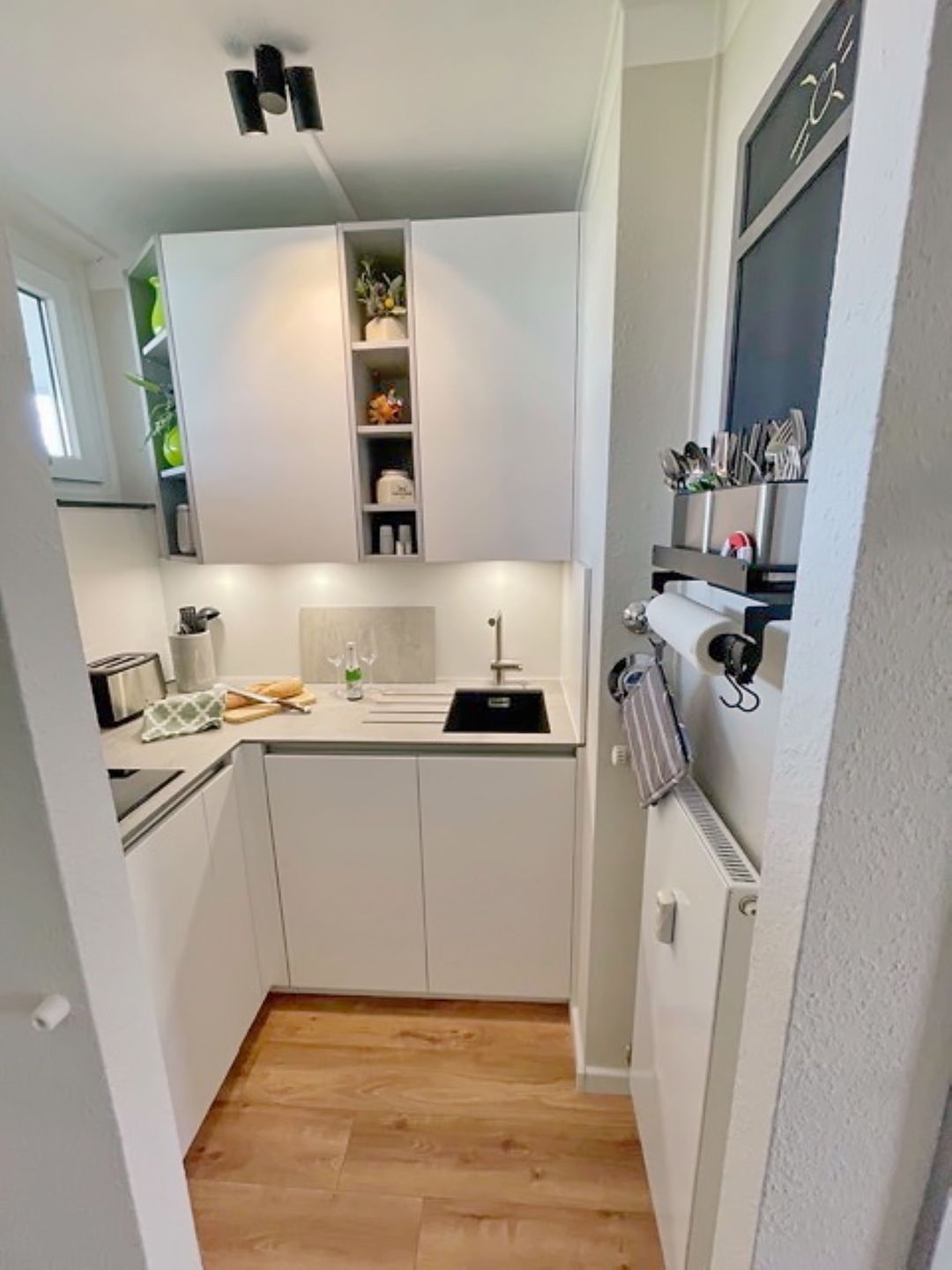 Die in 2023 neu eingebaute Küche verfügt über einen Kühlschrank mit Gefrierfach, Geschirrspüler, Induktionskochfeld (2-Platten), Mikrowelle, sowie Toaster und Wasserkocher.