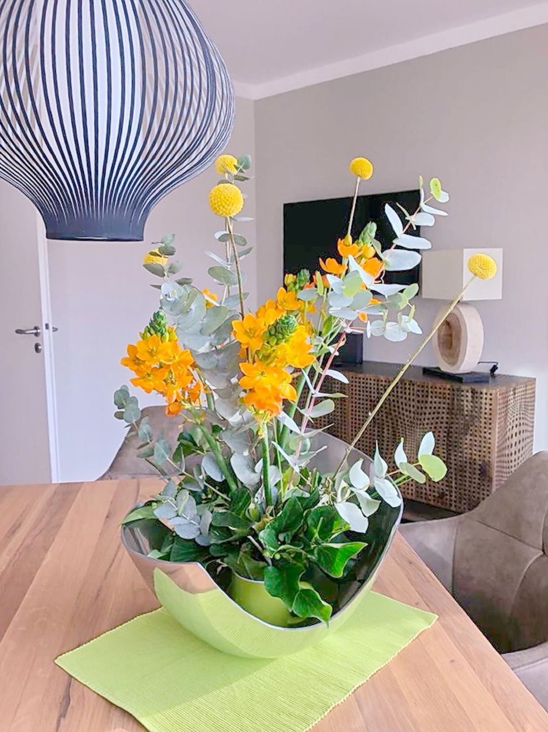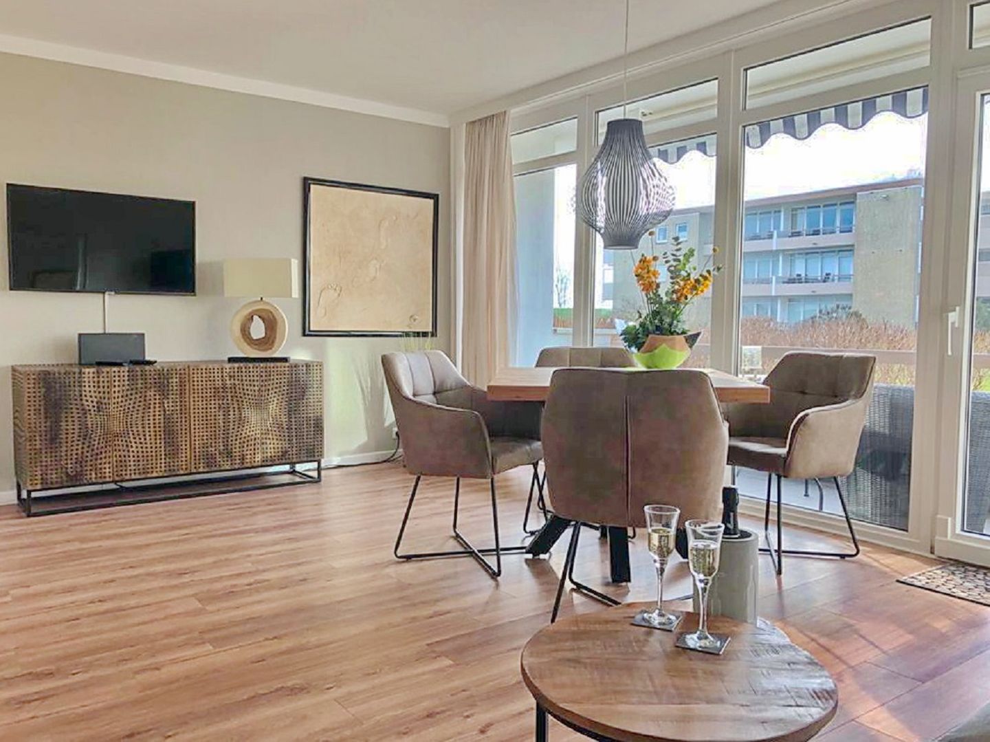 Die Wohnung ist ausgestattet für zwei Erwachsene und verfügt über einen komplett ausgelegten Vinylfußboden in Eiche-Natur-Optik, der Wohn-/Essbereich ist ausgestattet mit einem Esstisch in Natureiche mit 4 Stühlen, gemütlichem Hussensofa, sowie einem High- und Lowboard. Fürs Entertainment sorgt ein 50“ Smart-Flach-TV mit Soundbar und eine moderne Musikanlage (Bluetoothfähig).