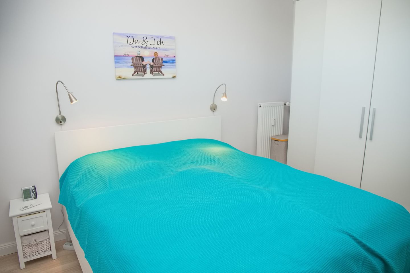 Im separaten Schlafzimmer sorgt ein komfortables Doppelbett (160 x 200 cm) mit durchgehendem Topper für erholsamen Schlaf. Verdunkelungsgardinen garantieren eine angenehme Nachtruhe, auch an hellen Sommermorgen. Zwei Nachttische sowie ein geräumiger Kleiderschrank bieten genügend Stauraum für Ihre persönlichen Dinge. Das Badezimmer ist mit einer Dusche, einem WC sowie einem Waschbecken mit praktischer Ablage ausgestattet.