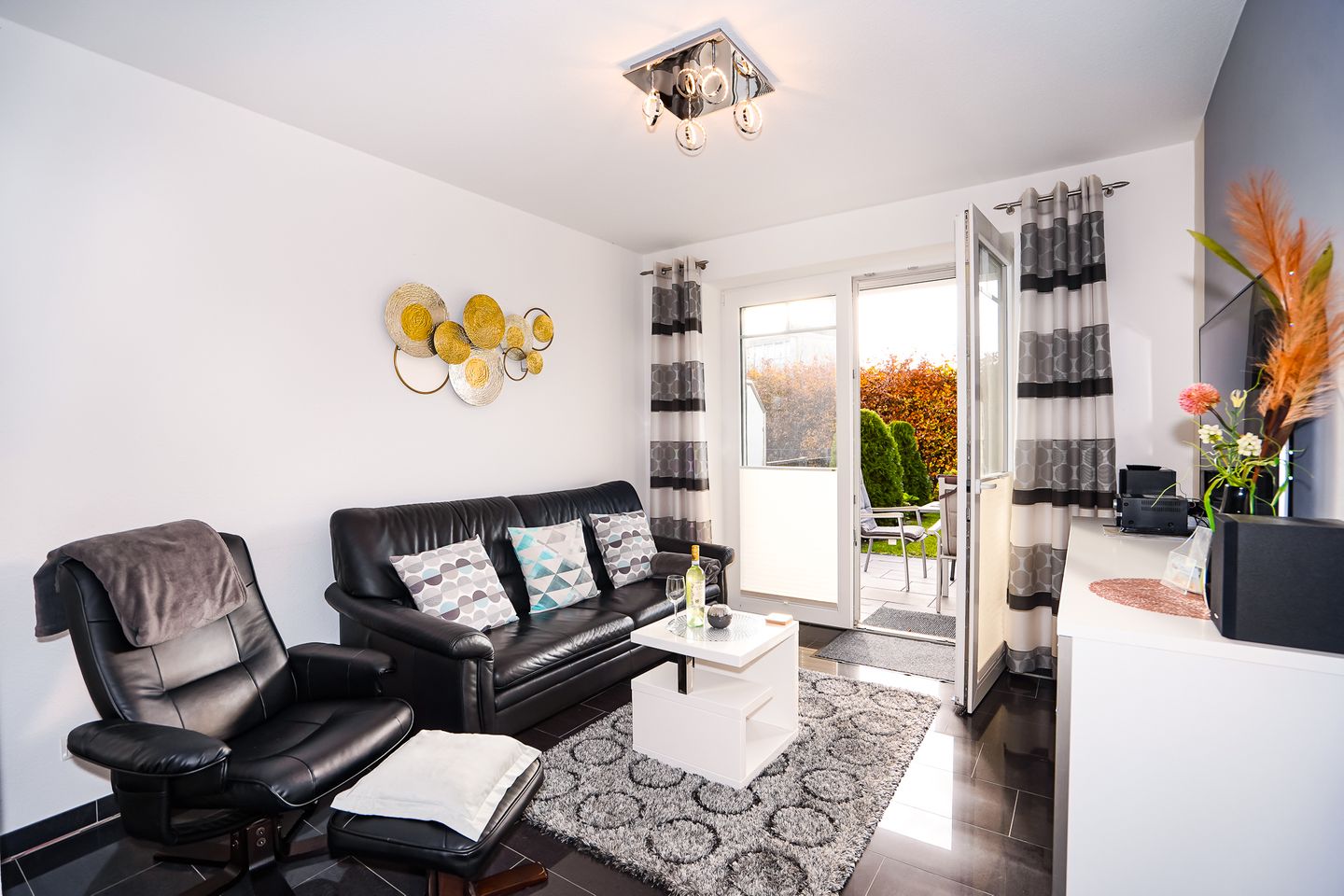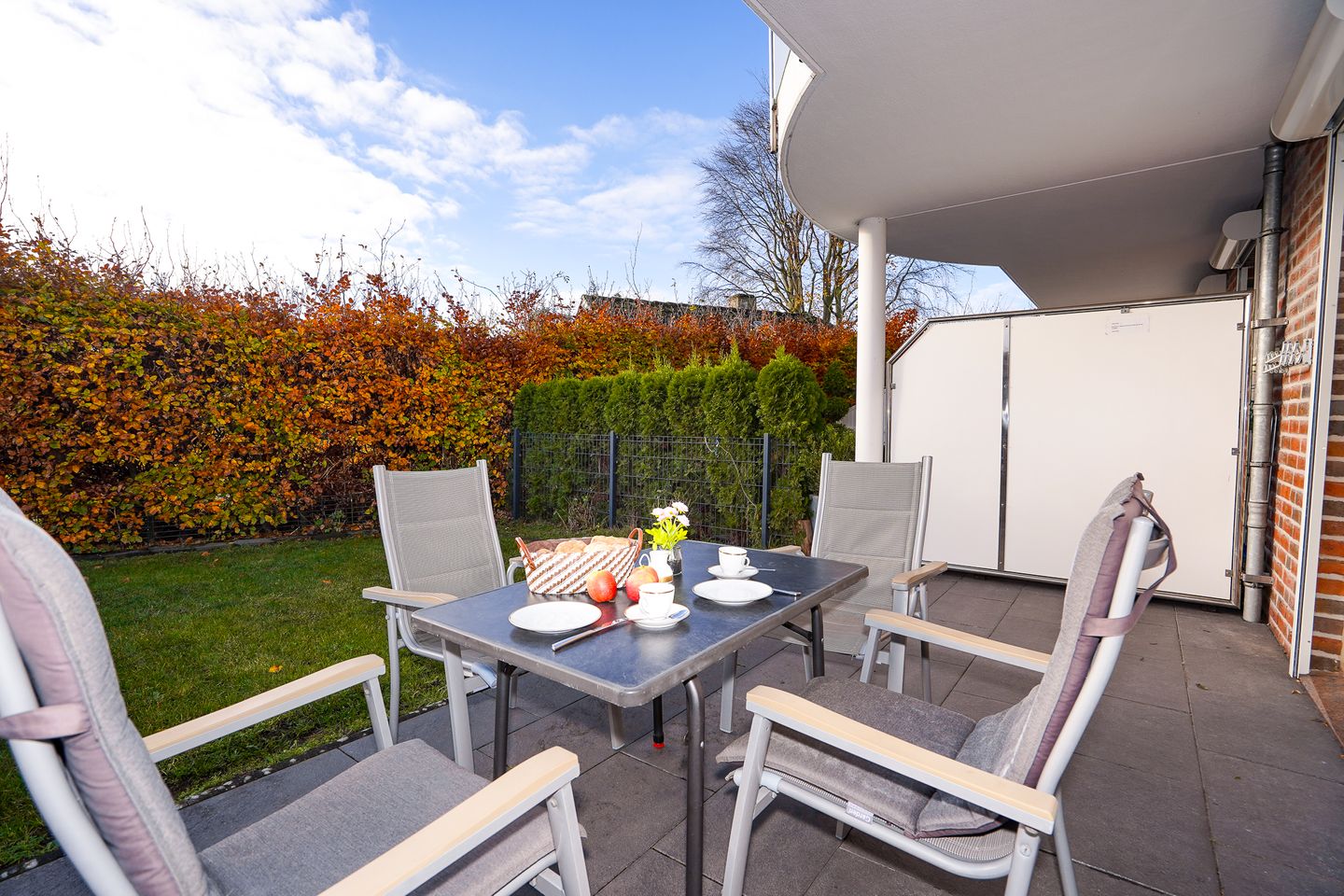 Entspannen Sie auf der eigenen Terrasse, die mit Gartenmöbeln ausgestattet ist. Hier können Sie die frische Ostseeluft und sonnige Stunden genießen, während der vorhandene Sonnenschutz für angenehme Schattierung sorgt. Für Ihr Fahrzeug steht ein kostenfreier Privatparkplatz direkt am Haus bereit.