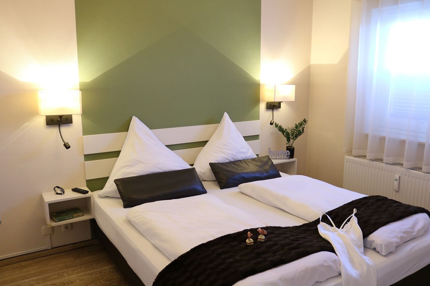 Das Schlafzimmer ist mit einem komfortablen Doppelbett (zwei Matratzen à 90x200 cm) ausgestattet und bietet zudem einen großen Kleiderschrank für ausreichend Stauraum. Ein weiterer Flachbildfernseher im Schlafzimmer sorgt für zusätzlichen Komfort.