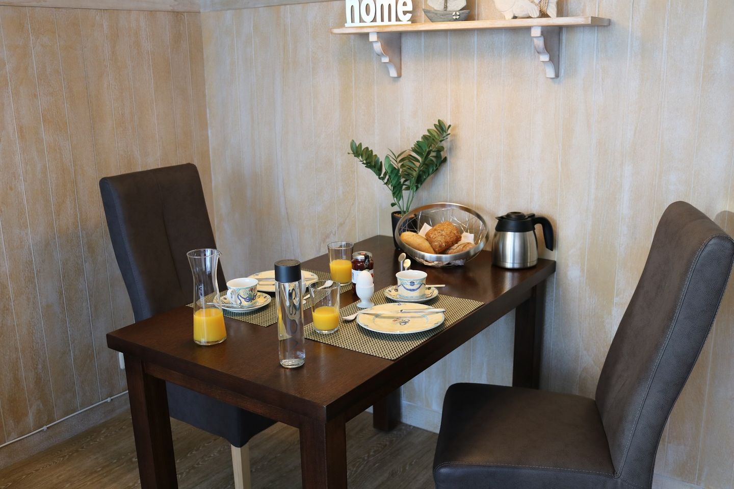 Der Essbereich ist für zwei Personen ausgelegt und bietet einen gemütlichen Platz für gemeinsame Mahlzeiten. In der separaten Küche finden Sie alles, was Sie für die Zubereitung Ihrer Speisen benötigen: ein Ceranfeld ohne Backofen, eine Dunstabzugshaube, einen Kühlschrank mit Gefrierfach, eine Kaffeemaschine, einen Wasserkocher, einen Toaster und eine Mikrowelle.