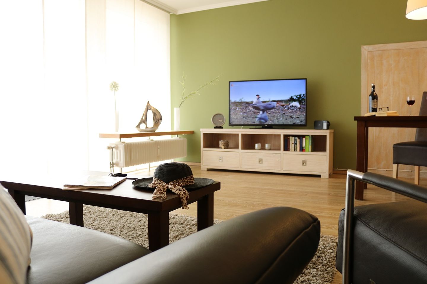 Das Wohnzimmer ist mit einer eleganten 3er Ledercouch, einem passenden Sessel und einem Hocker ausgestattet und bietet somit eine komfortable Sitzgelegenheit. Ein Flachbildfernseher sorgt für entspannte Abende. Vom Wohnzimmer aus haben Sie direkten Zugang zum Balkon, der zum Verweilen und Entspannen einlädt.