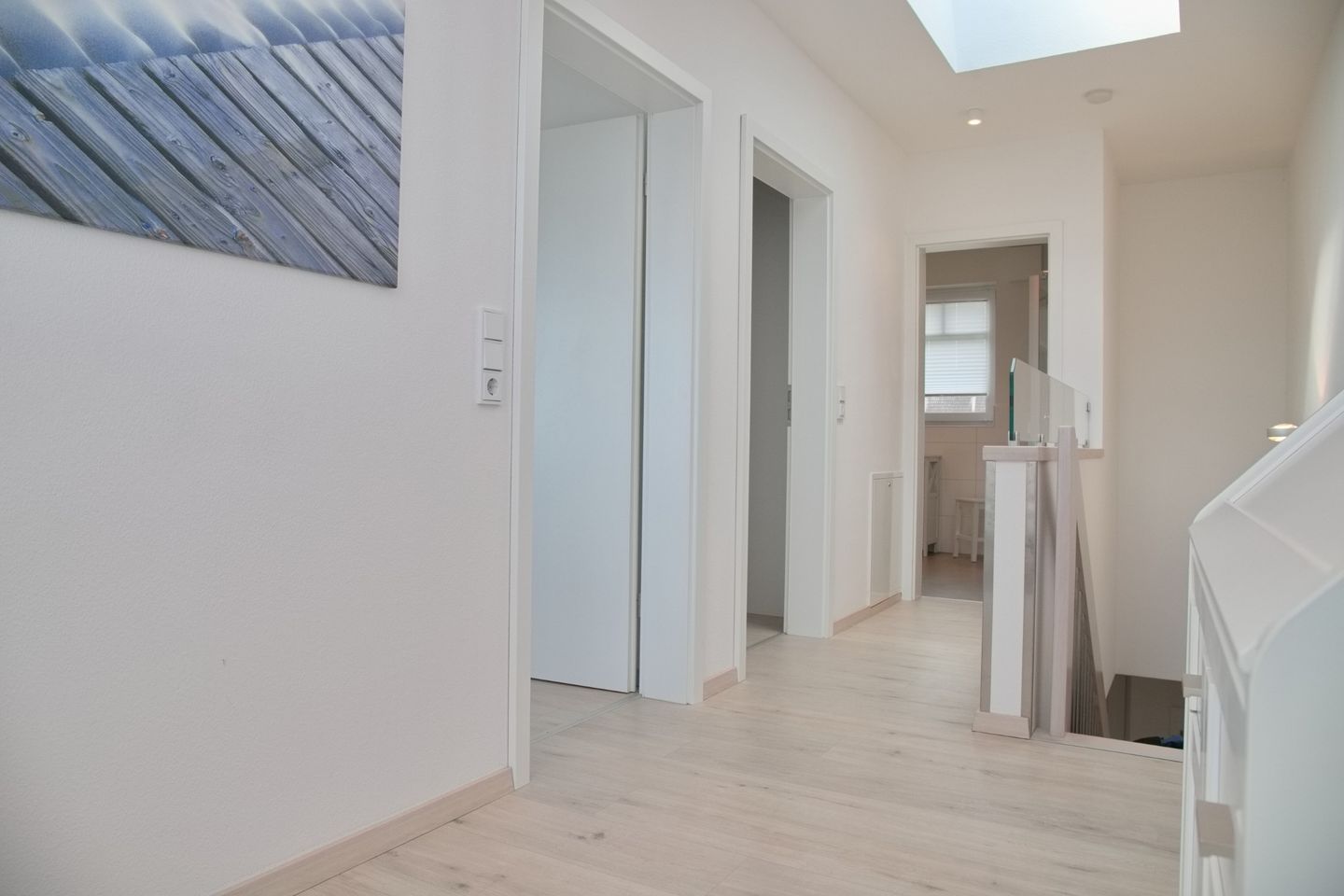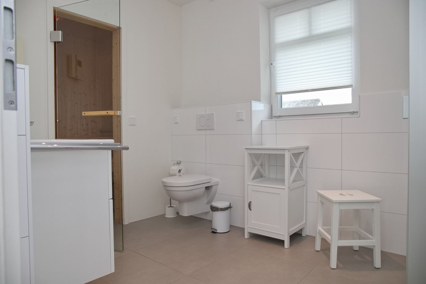 Das großzügige Bad im Obergeschoss ist ebenfalls modern gestaltet und verfügt über eine große bodengleiche Dusche, ein Waschbecken, ein WC sowie eine Sauna – ideal, um nach einem langen Strandtag zu entspannen.
