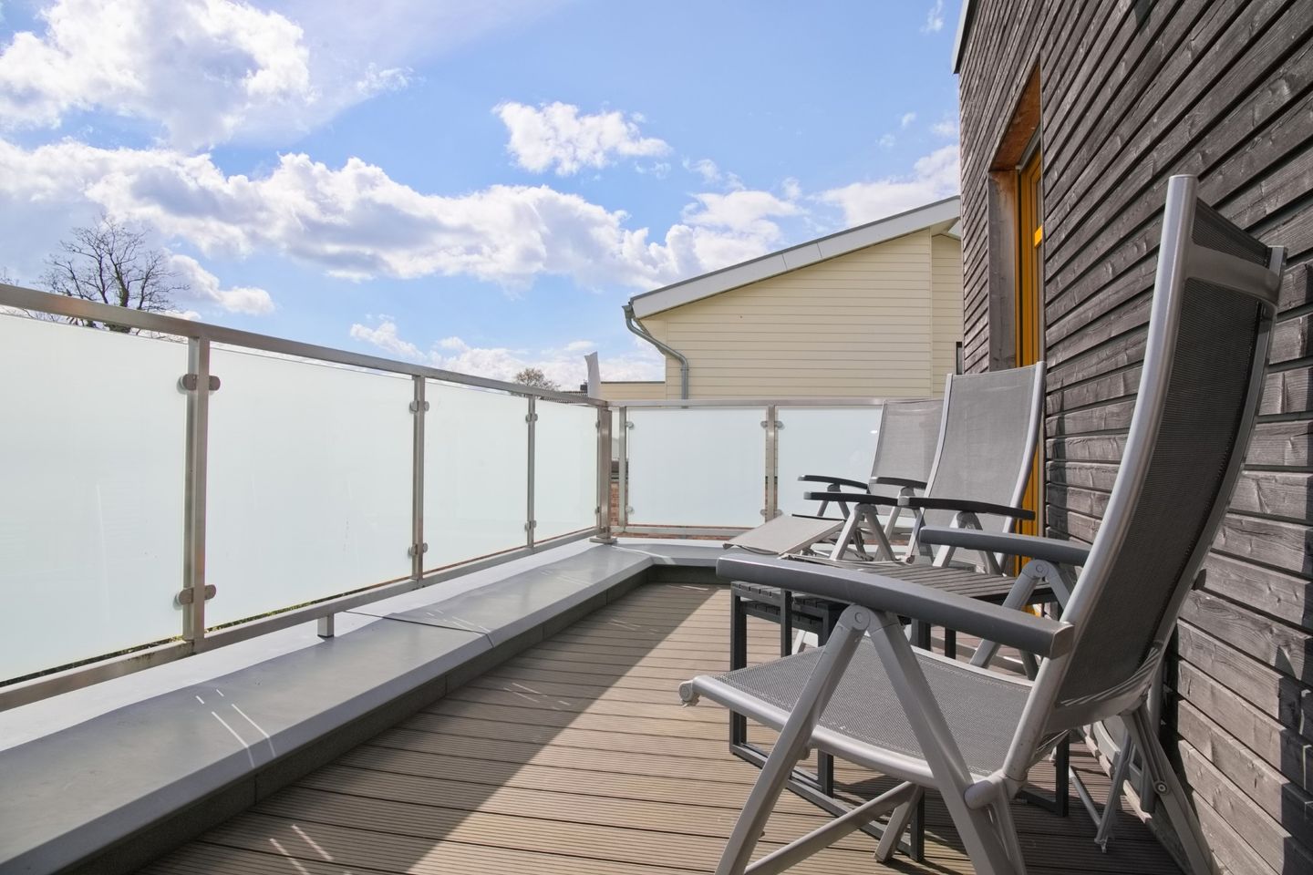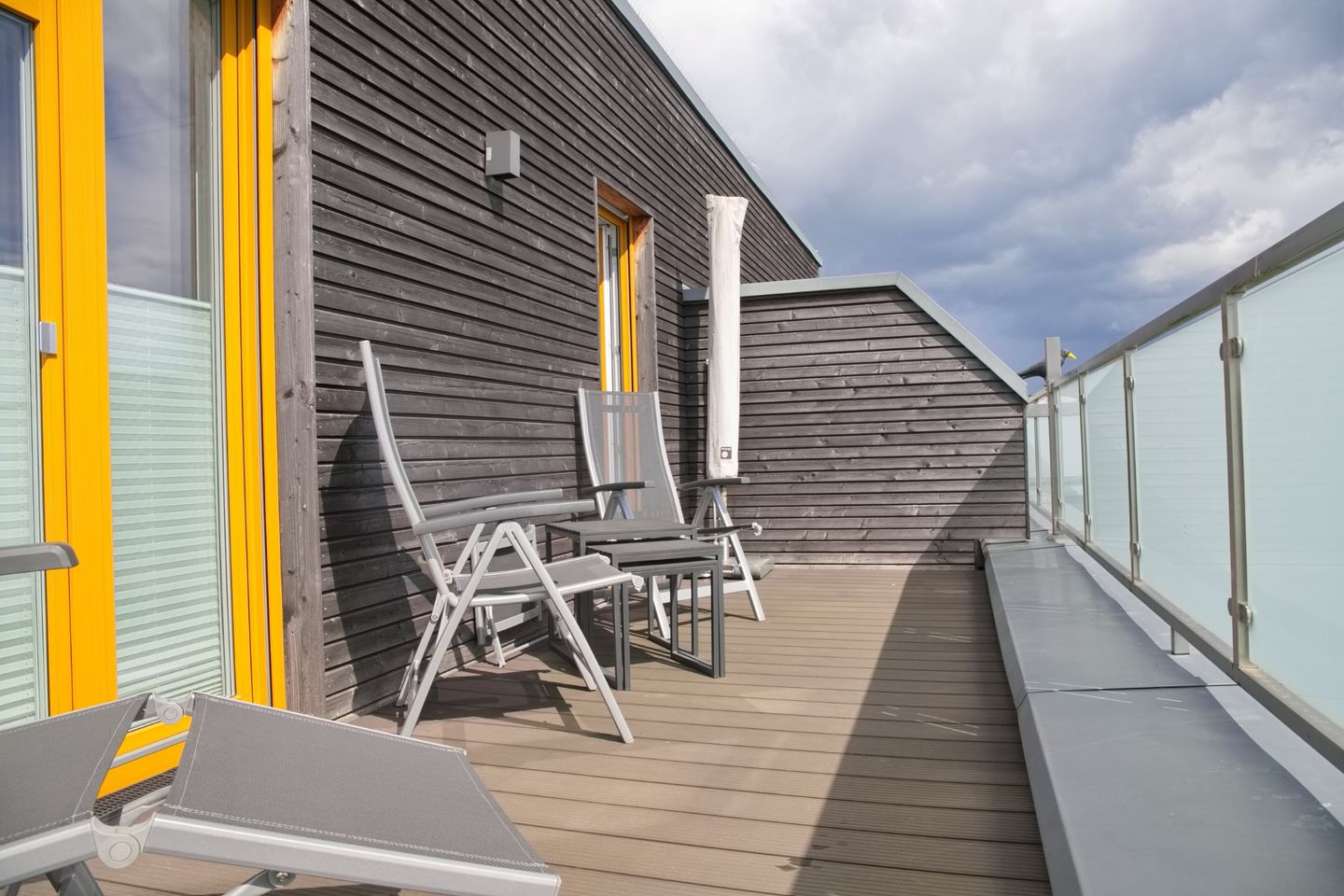 24qm Südterrasse mit elektrischer Markise, Sitzgarnitur und Strandkorb.