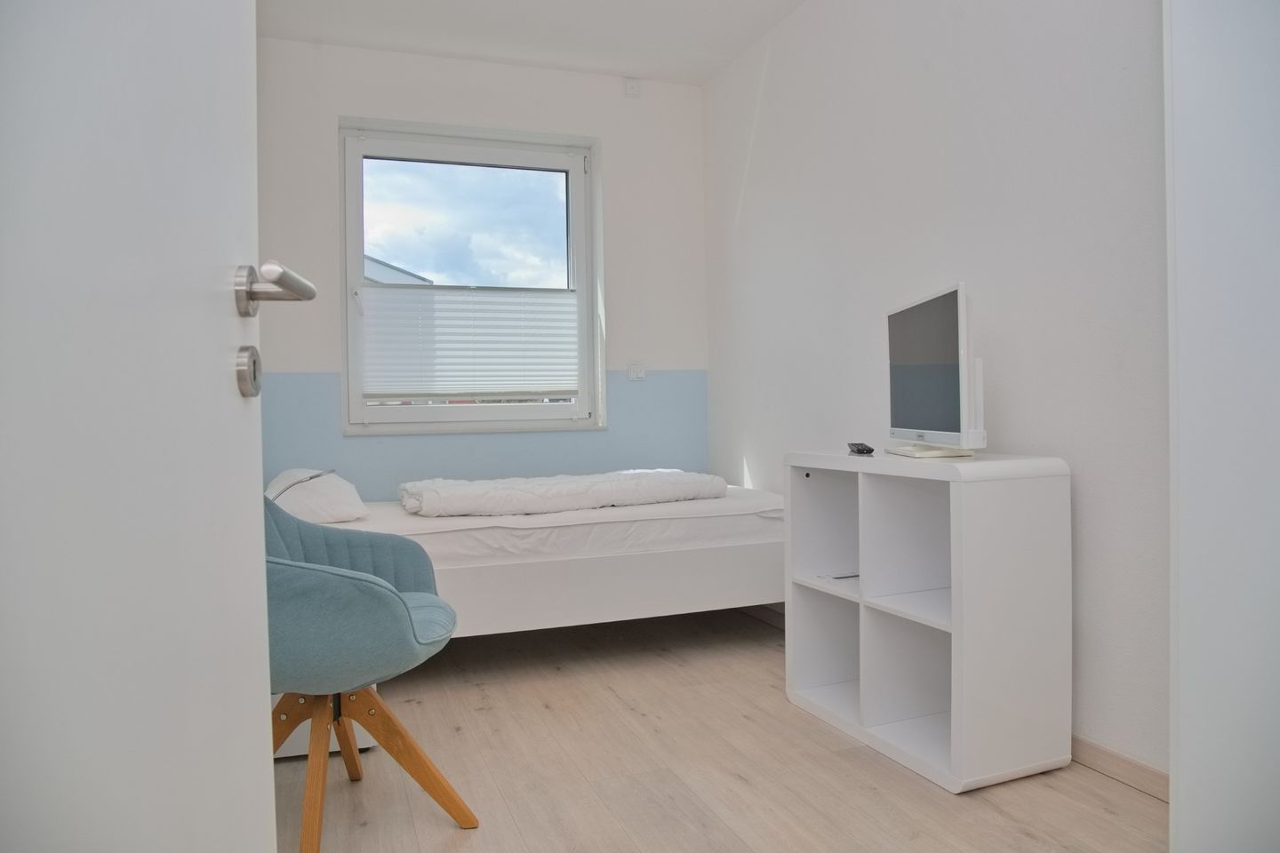 Außerdem befindet sich im Erdgeschoss ein Schlafzimmer mit einem komfortablen Doppelbett, einem Kleiderschrank und einem kleinen Sessel. Das moderne Bad ist durch ein bodentiefes Fenster lichtdurchflutet. Es verfügt über eine bodengleiche Dusche, ein WC, ein Waschbecken und einen praktischen Waschtrockner. Wäscheständer vorhanden.