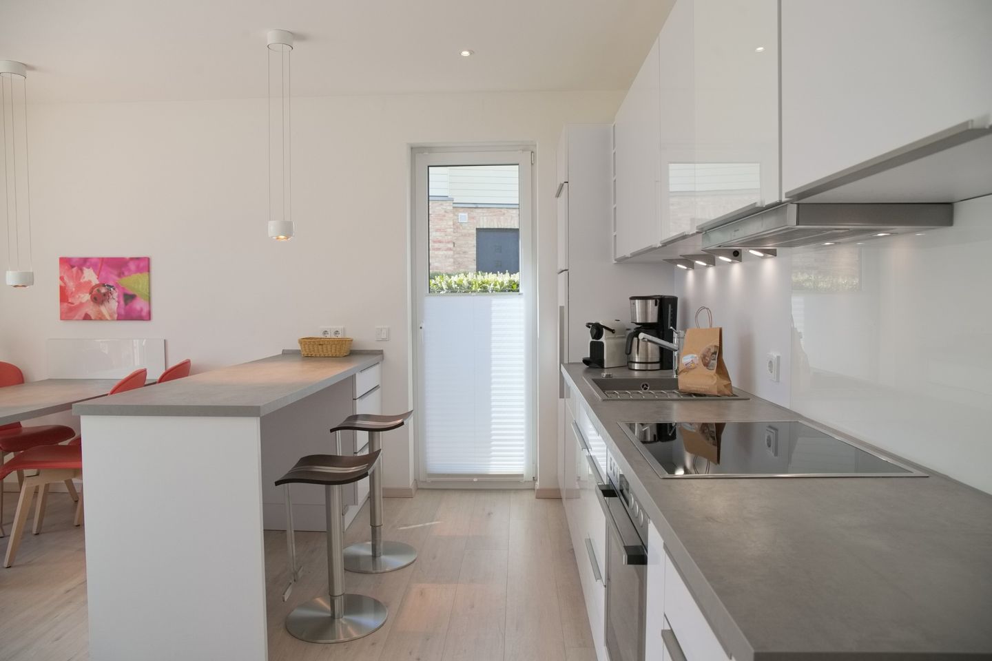Die offene Küche ist komplett ausgestattet mit einem Kühlschrank samt Gefrierfach, einem Geschirrspüler, einem Induktionsherd, Backofen, einer Mikrowelle, einem Wasserkocher, einer Kaffeemaschine, einer Nespresso-Kapselmaschine und einem Toaster – perfekt für all Ihre kulinarischen Bedürfnisse. Ein zusätzlicher Küchentresen mit großer Arbeitsplatte bietet Platz für zwei weitere Sitzmöglichkeiten.