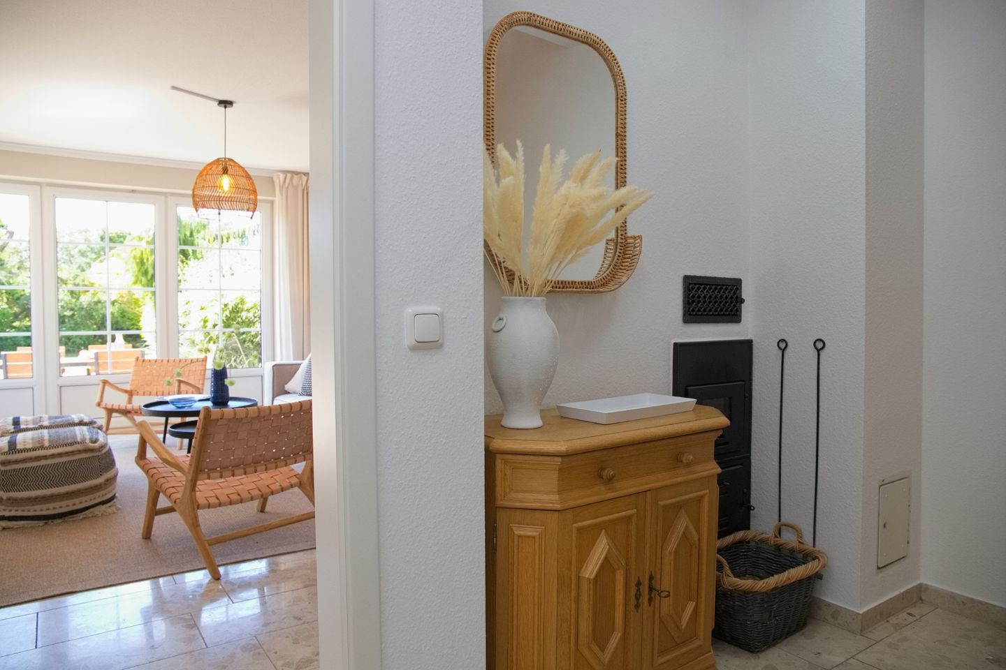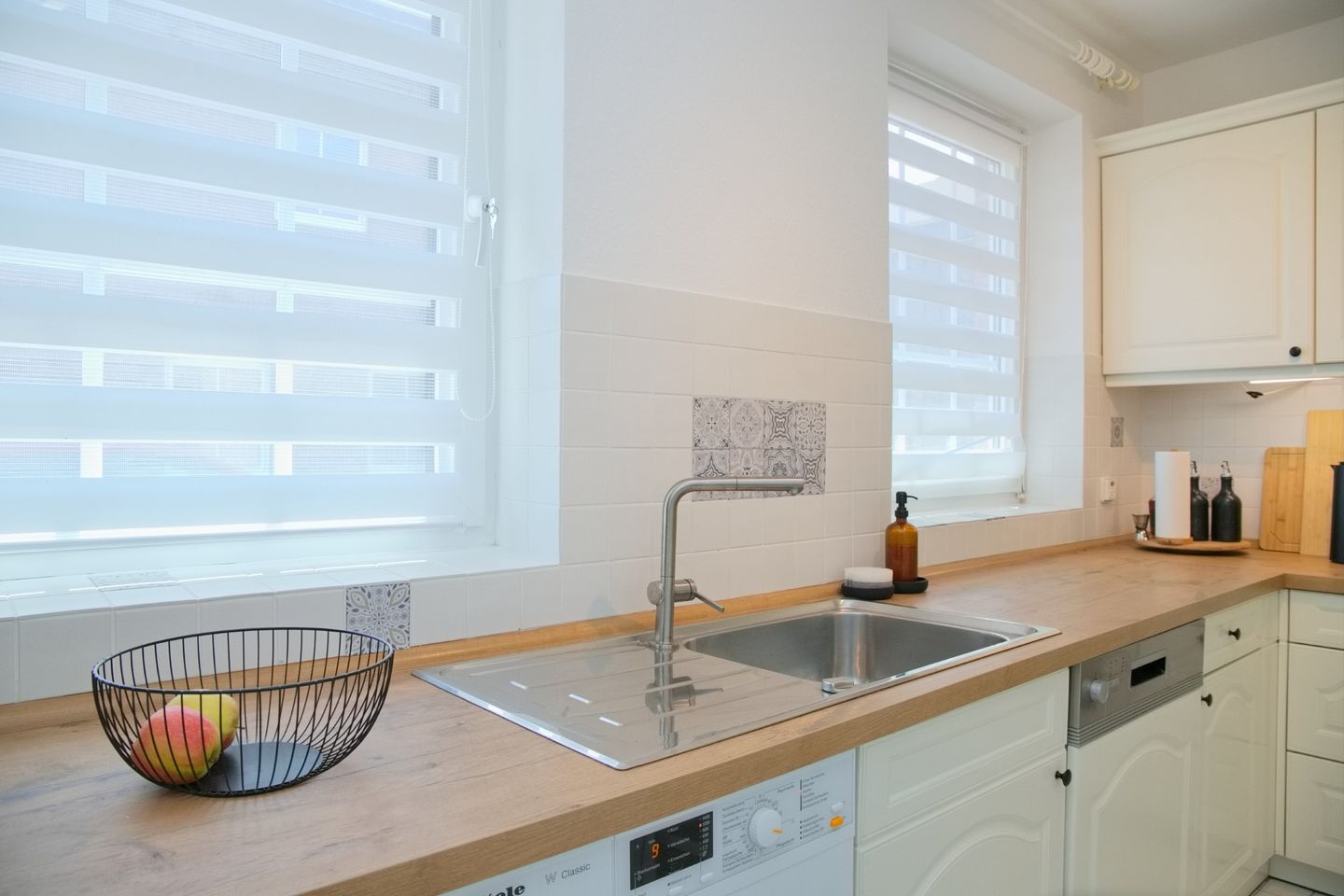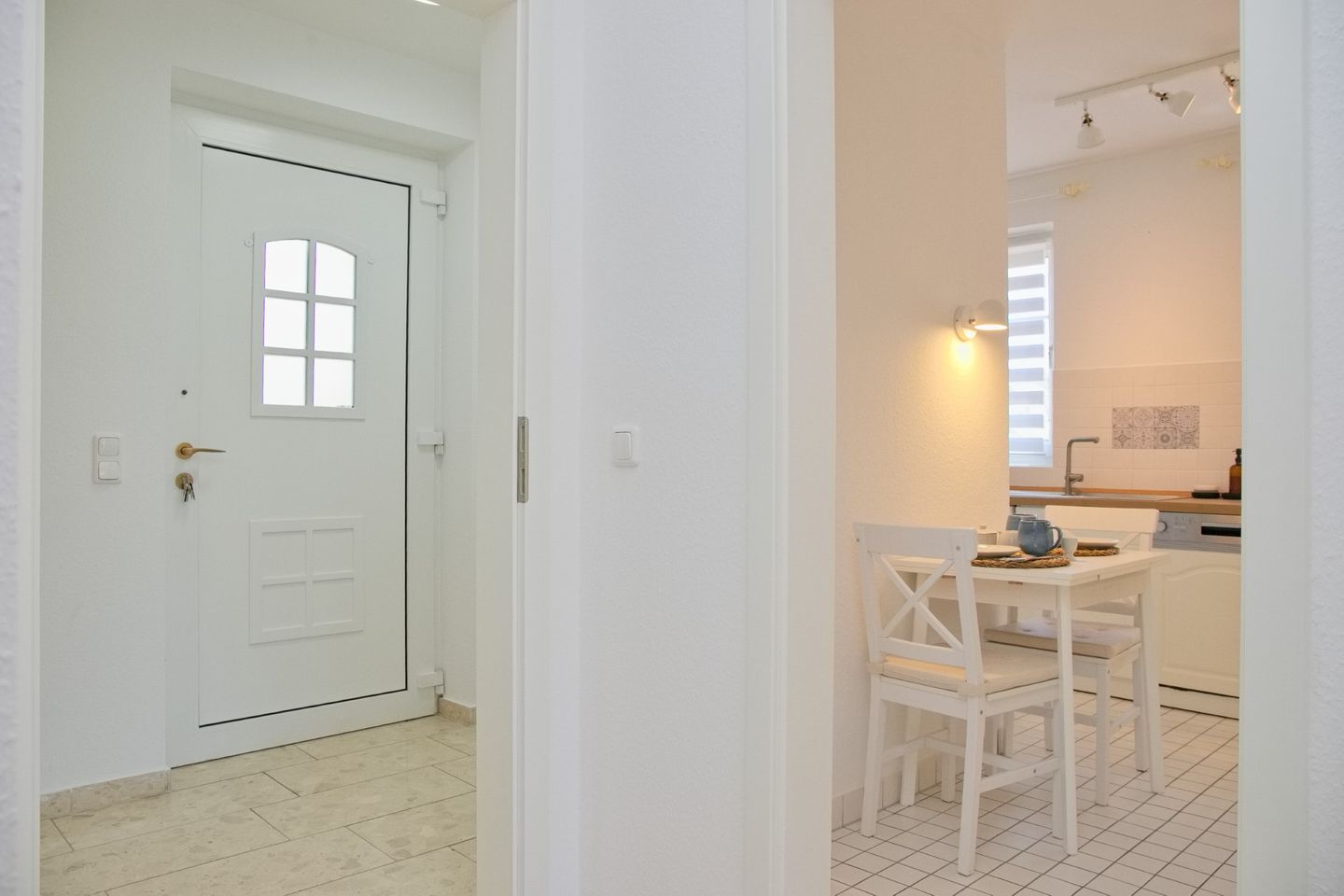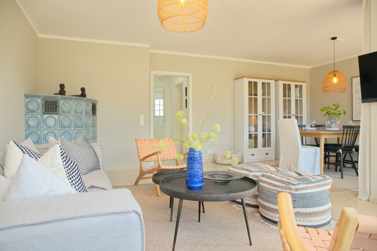 Die lichtdurchfluteten Räume bieten eine einladende Atmosphäre, besonders im Wohn- Essbereich mit Platz für 4 Erwachsenen Personen plus Kleinkind. Die separate Landhausküche beeindruckt mit weißem Design und einem gemütlichen Essplatz für zwei.