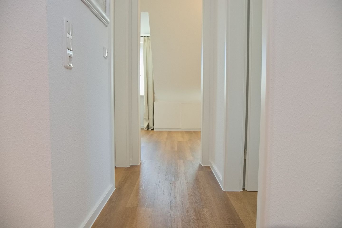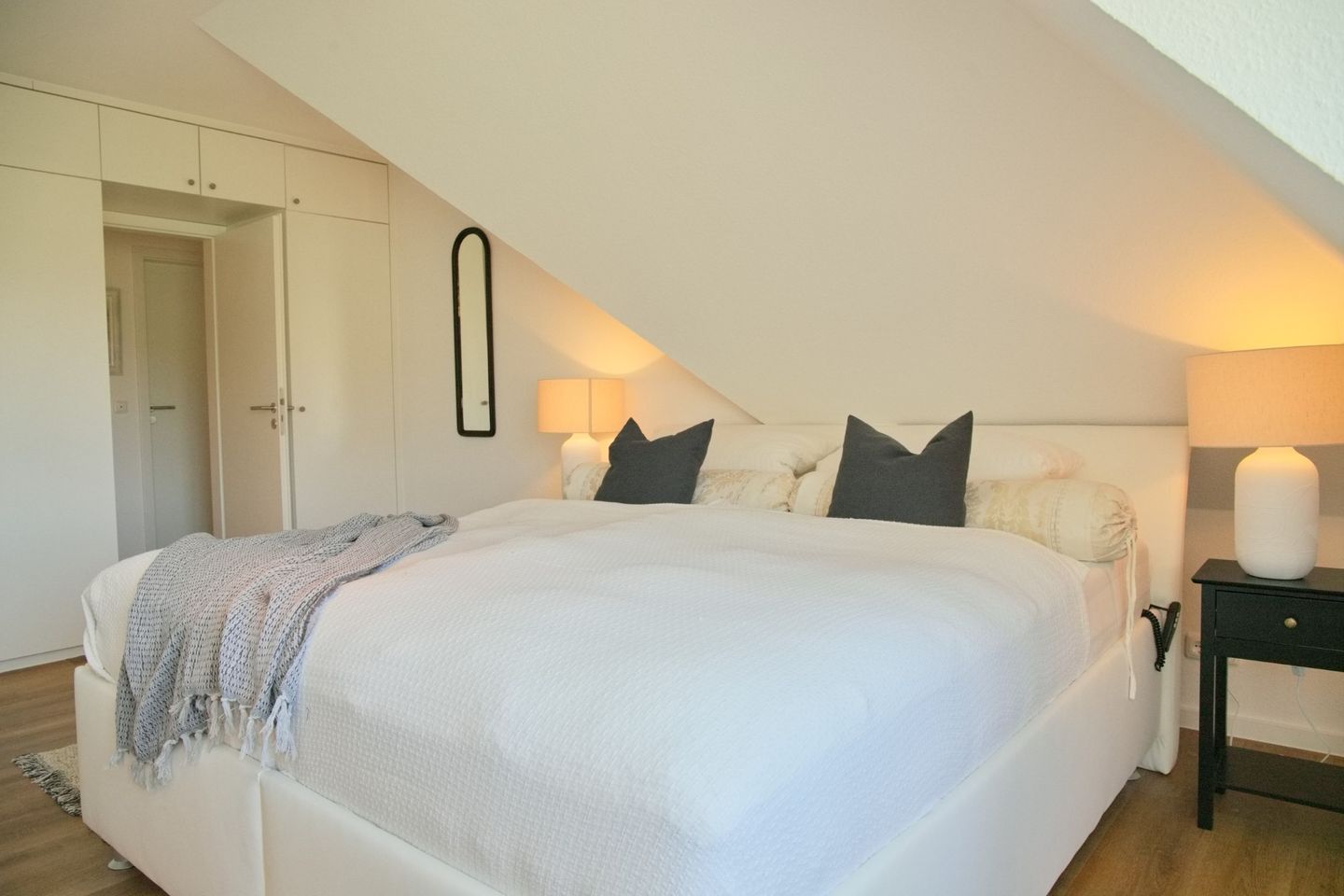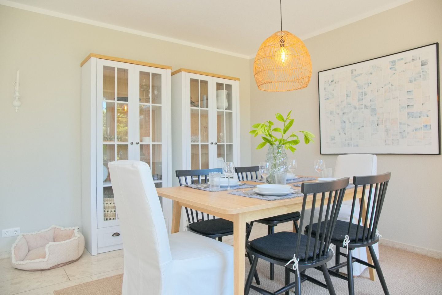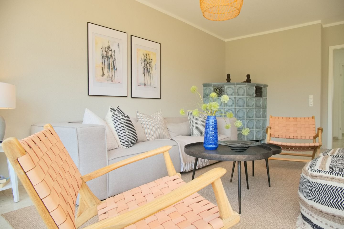 Die lichtdurchfluteten Räume bieten eine einladende Atmosphäre, besonders im Wohn- Essbereich mit Platz für 4 Erwachsenen Personen plus Kleinkind. Die separate Landhausküche beeindruckt mit weißem Design und einem gemütlichen Essplatz für zwei.