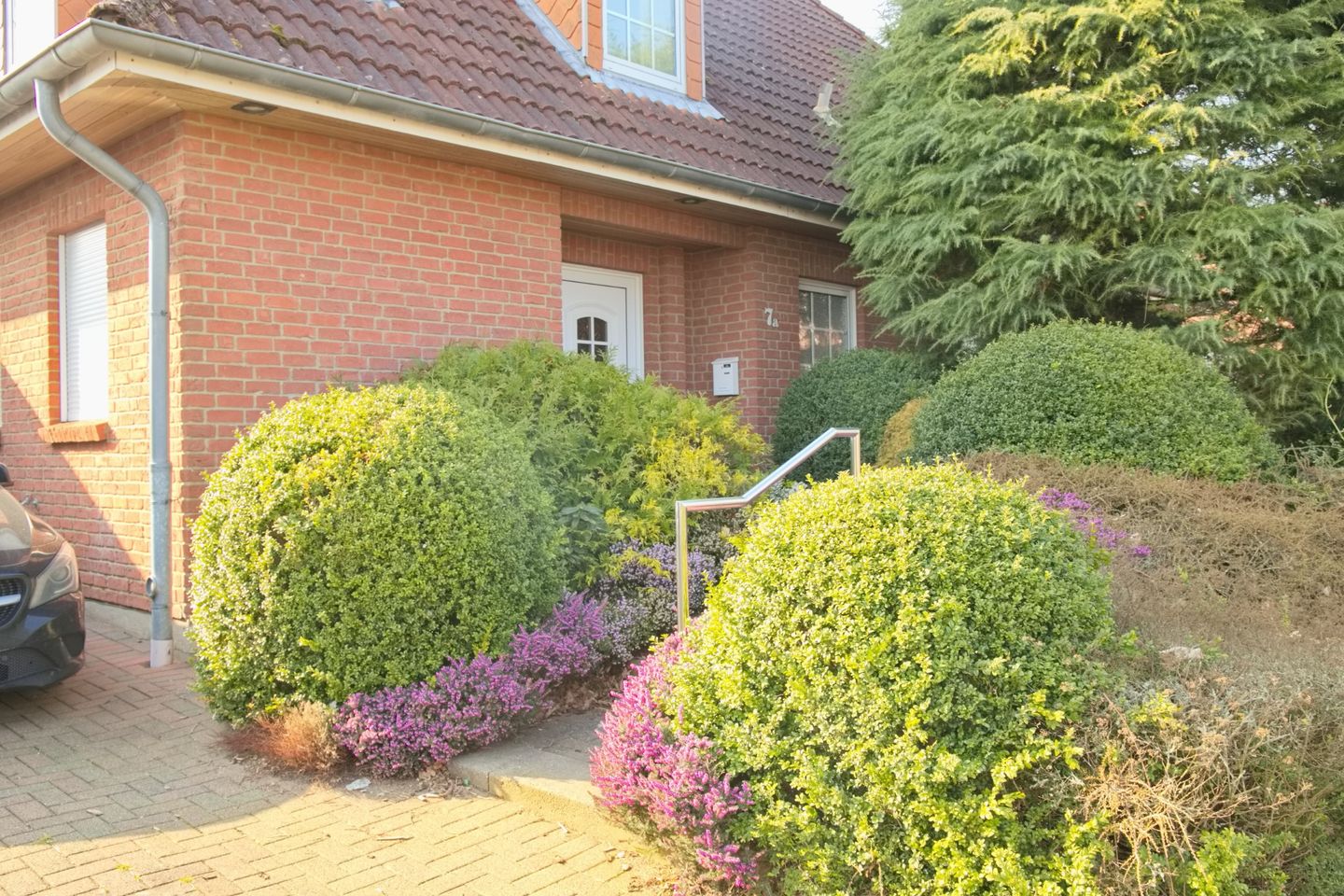 Der schön angelegte Garten mit Südwest-Ausrichtung ist eingezäunt und bietet Zugang zu den angrenzenden Feldern durch ein kleines Gartentor. Die Terrasse ist mit einem Esstisch für 6 Personen und zwei Liegestühlen möbliert, während Markisen für angenehmen Schatten sorgen.