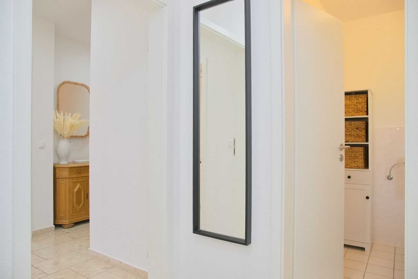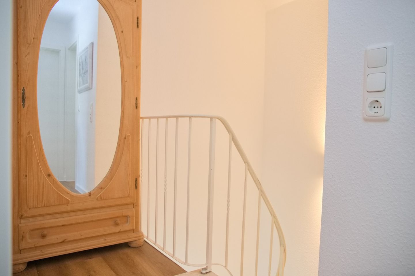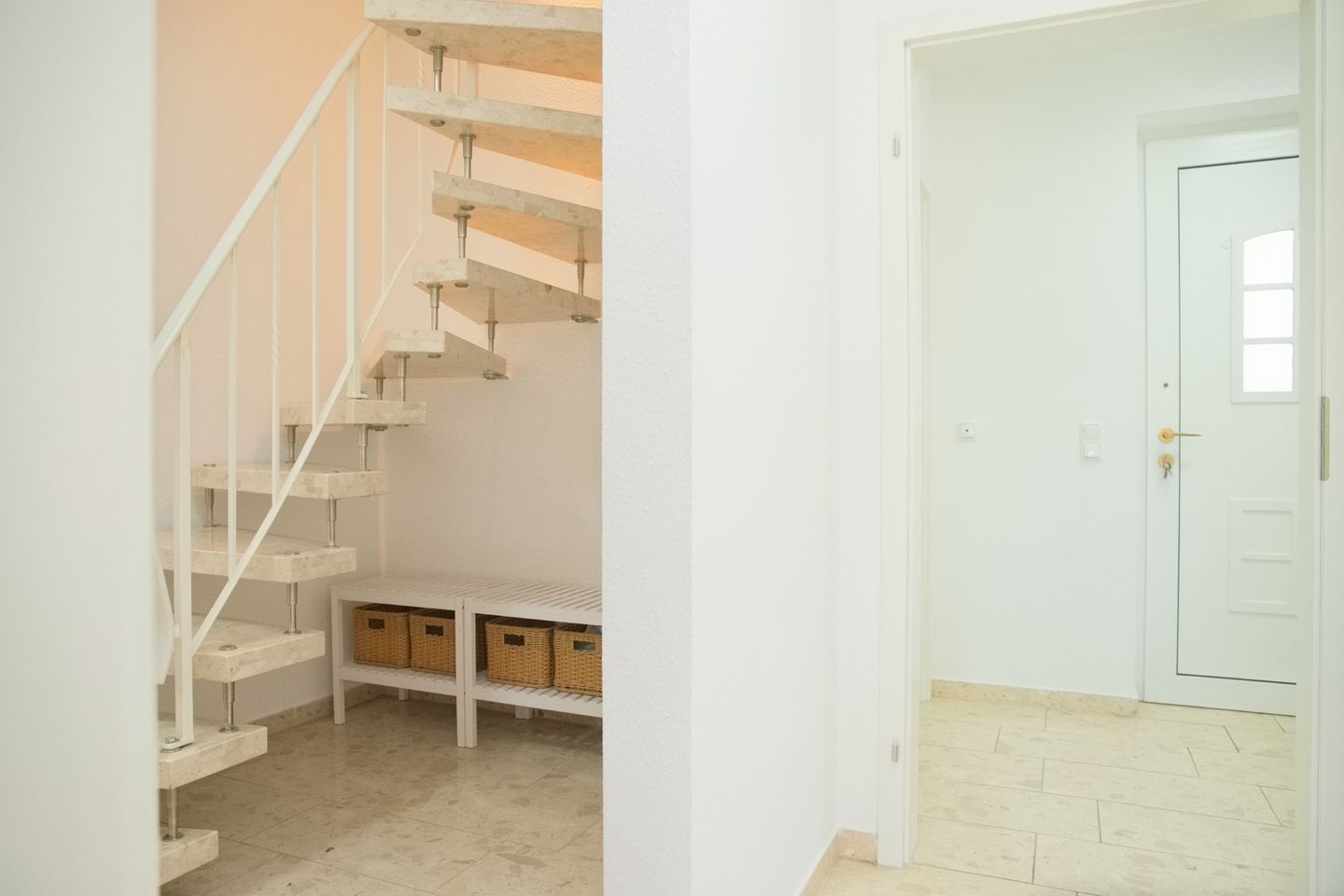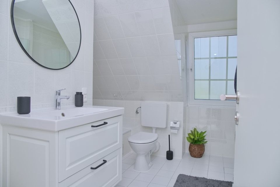 Im Erdgeschoss befindet sich ein geräumiges Gäste-WC mit einem großen Fenster, das für Tageslicht und Frische sorgt. Der Windfang verfügt über einen Einbauschrank mit ausreichend Stauraum für Jacken und Schuhe.