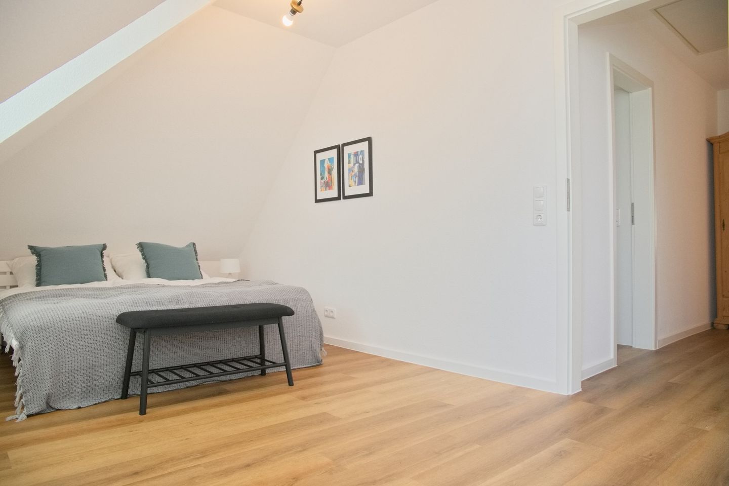 Das Hauptschlafzimmer ist mit einem großzügigen Einbauschrank ausgestattet, der viel Stauraum bietet. Das Doppelbett ermöglicht einen erholsamen Schlaf, während das Fenster einen Ausblick auf die umliegenden Felder und schrägen Meerblick gewährt.