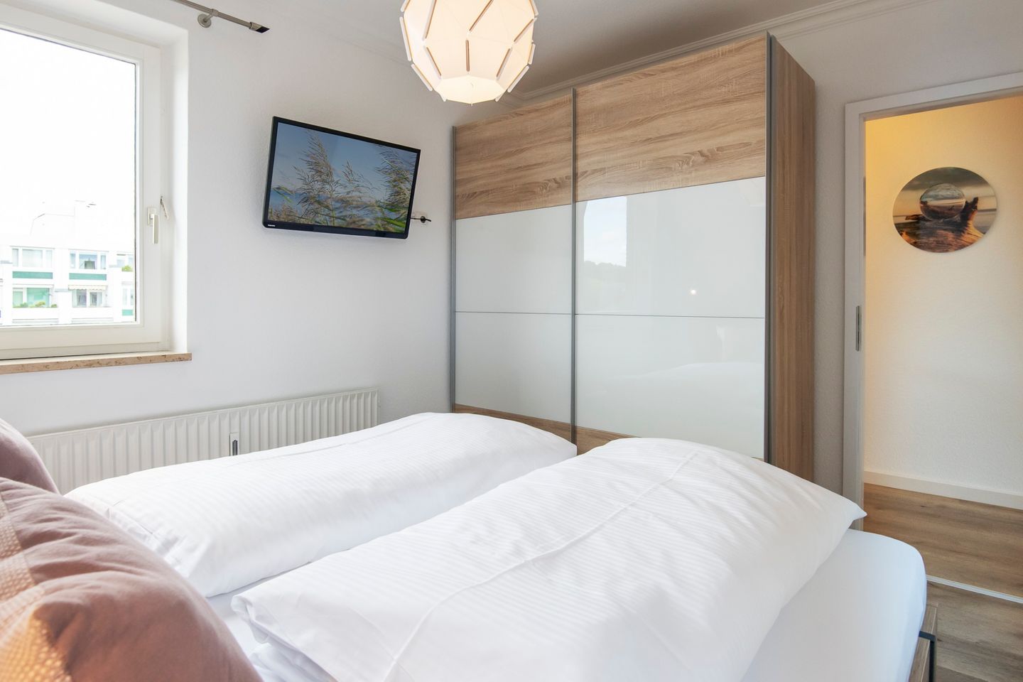 Die angebotene Ferienwohnung verfügt über zwei Zimmer und bietet Platz für bis zu vier Personen. Das Schlafzimmer ist mit einem Doppelbett ausgestattet und im Wohnzimmer befindet sich eine Schlafcouch, die bei Bedarf als weitere Schlafmöglichkeit genutzt werden kann.