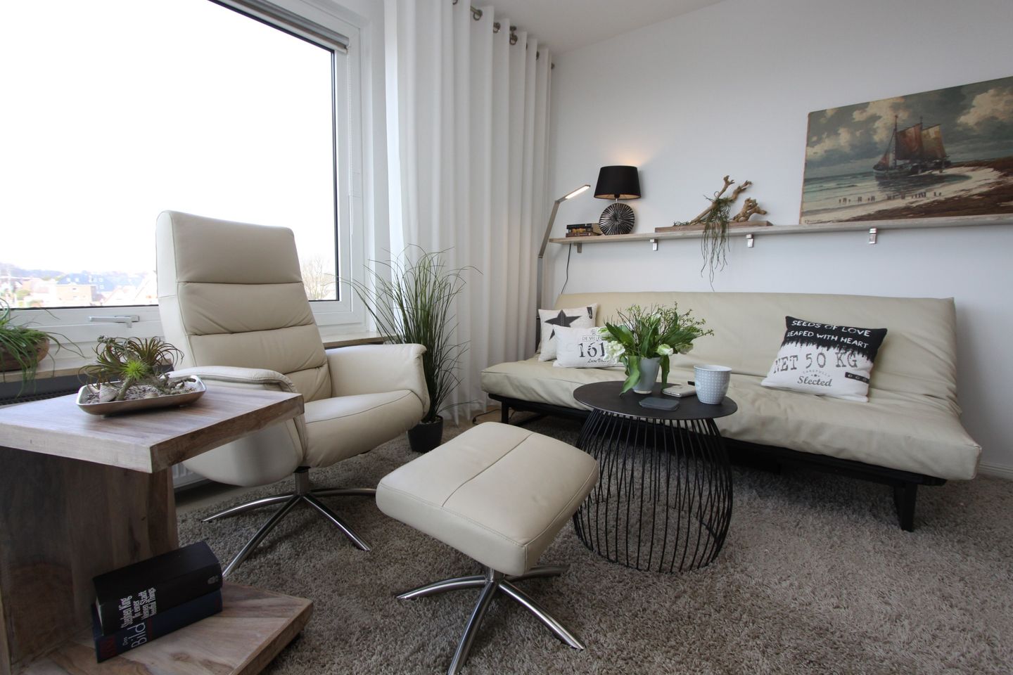 Der gemütliche Wohnbereich besticht mit seiner stilvollen Couch mit Ausrichtung zur See, einem Fernsehsessel mit Beistelltisch und Flach- TV.