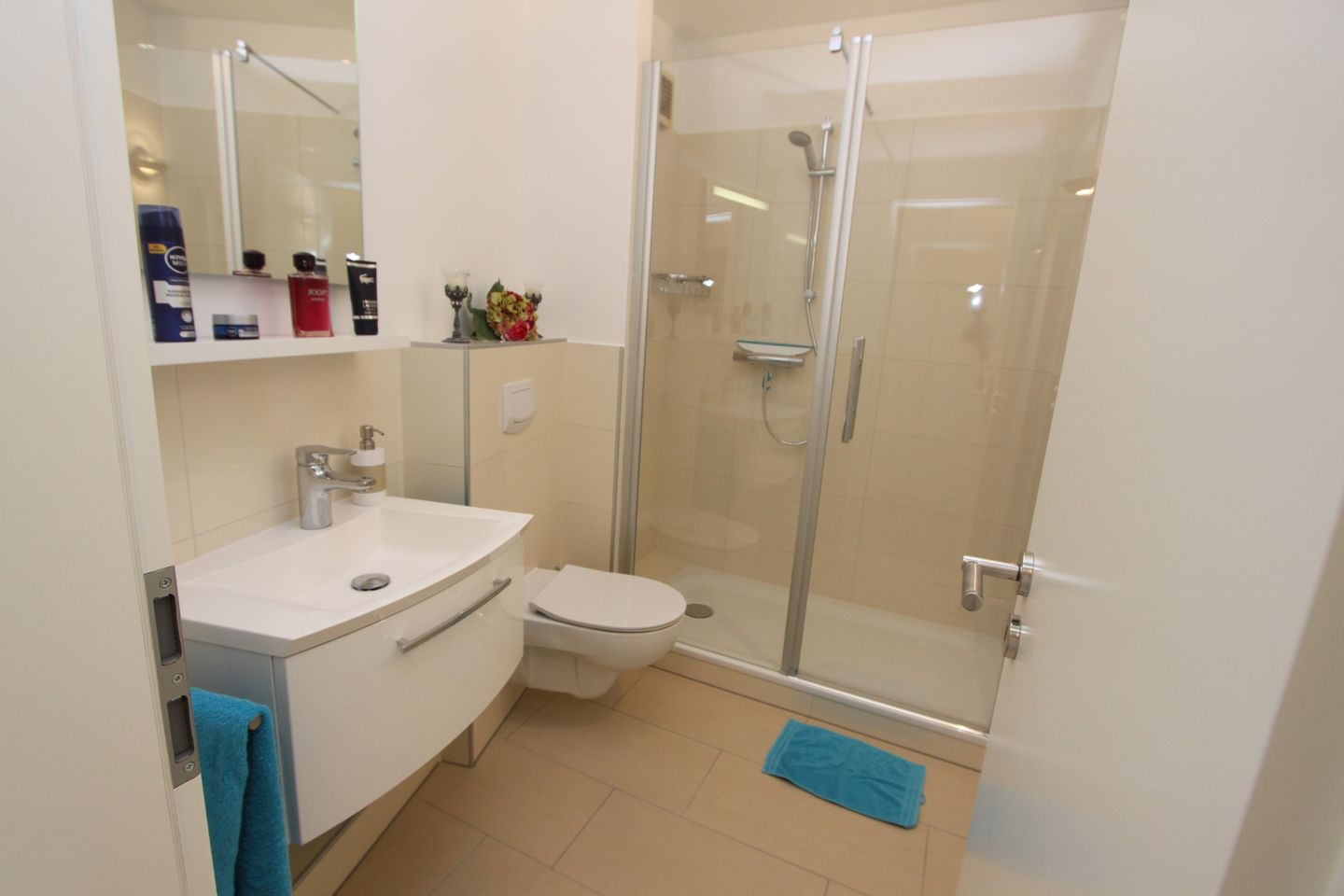 zu Ihrer rechten kommen Sie in das moderne Duschbad mit Waschtisch, Spiegel, WC und Handtuchheizung.