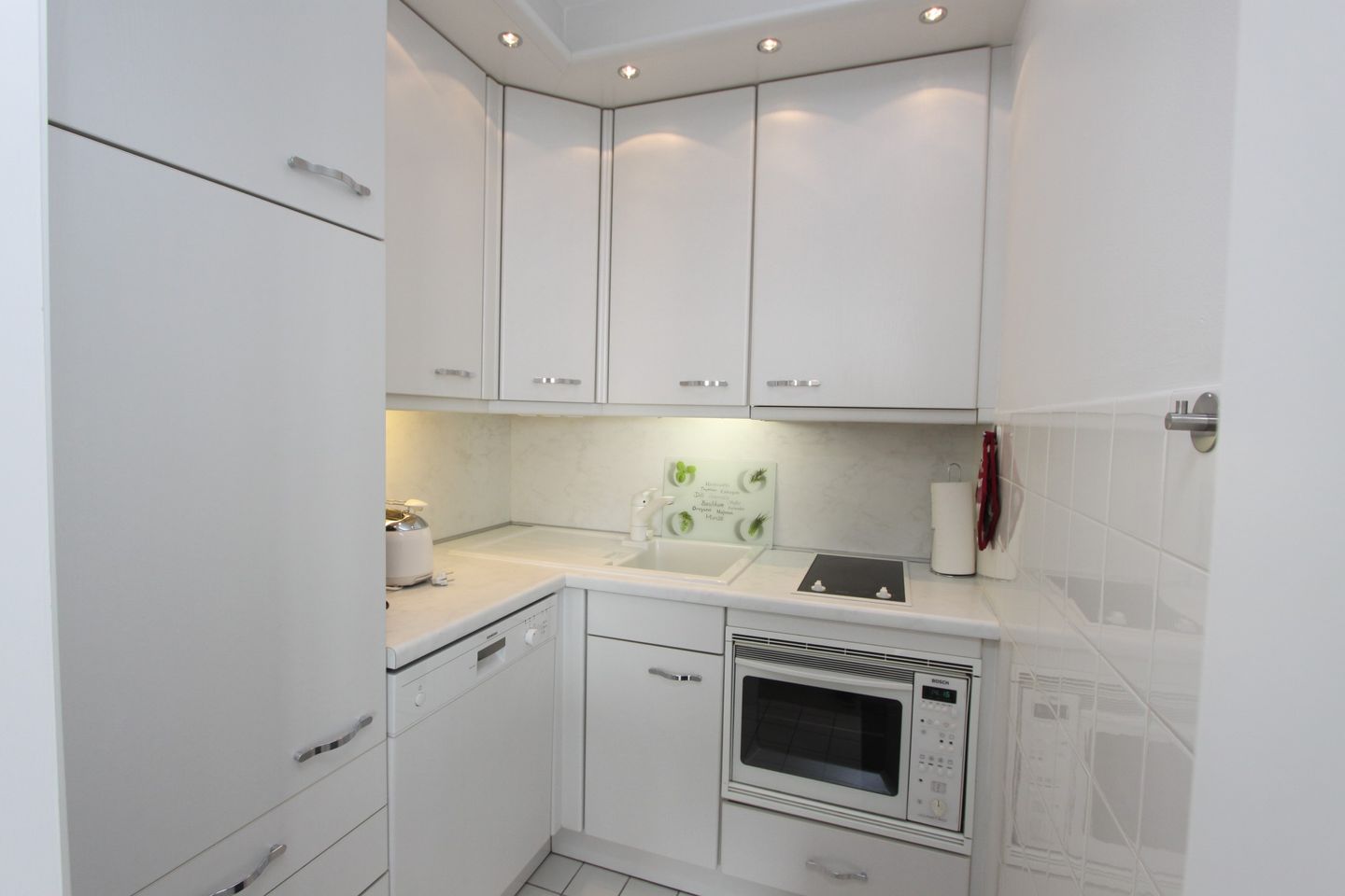 Die separate, halb offene Einbauküche zum Wohnzimmer ist ausgestattet mit einem 2- Plattenherd, Kühlschrank mit Gefrierfach, Spülmaschine, Mikrowelle mit Grillfunktion, Kaffeemaschine, Wasserkocher und Toaster.