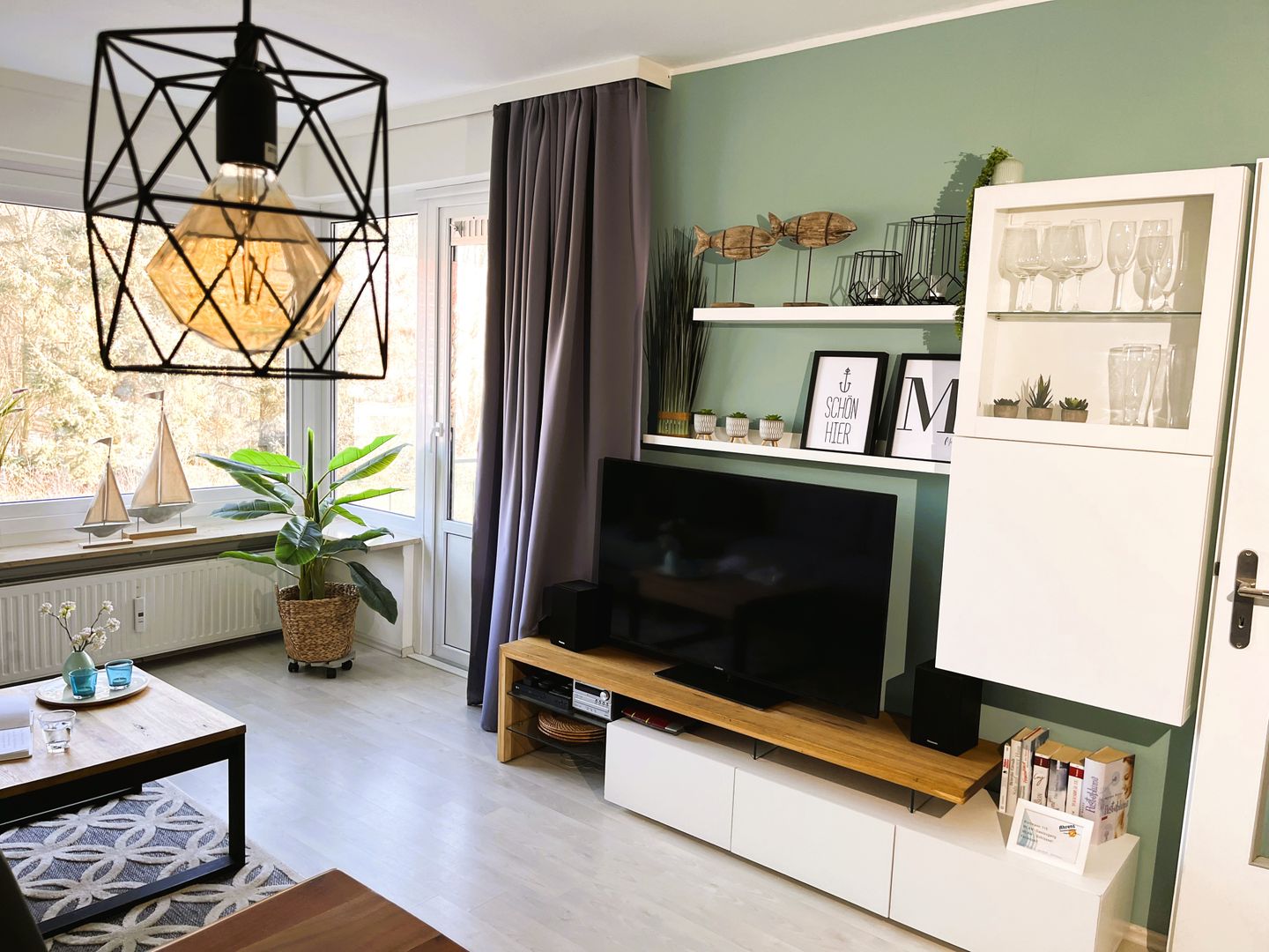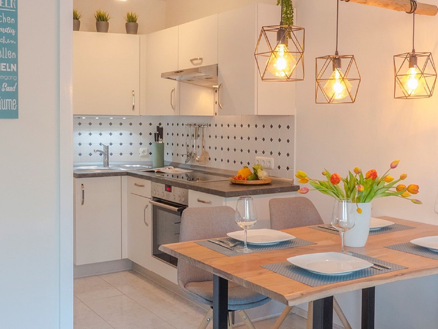 Herzlich Willkommen in dieser Modernen 2 Zimmer Ferienwohnung. Durch den Eingang gelangen Sie in den Flur, wo sich auf der linken Seite ein großer Einbauschrank befindet und ausreichend Platz für Ihre Sachen bietet. Zu Ihrer Rechten gelangen Sie in das helle neu renovierte Duschbad. Vom Flur gelangen Sie ins großzügige Wohnzimmer, hier finden Sie ein ausziehbares Schlafsofa, einen 50 Zoll smart TV und einen Blue Ray Player für lauschige Abende. Sollten Sie Musik bevorzugen, steht Ihnen eine Stereoanlage mit CD-Player zur Verfügung, die Sie auch bei einem gemütlichen Abendessen im offenen Essbereich zur Küche nutzen können oder beim zubereiten Ihrer Lieblingsspeisen in der zum Wohnraum offen gehaltenen Einbauküche. Die ist mit allem ausgestattet was das Herz begehrt, wie zum Beispiel: einem Cerankochfeld, einem Backofen, einem Kühlschrank mit kleinem Eisfach, einer Mikrowelle, einem kleinen Geschirrspüler, einer Kaffeemaschine, einem Wasserkocher, einem Toaster und einem Eierkocher.