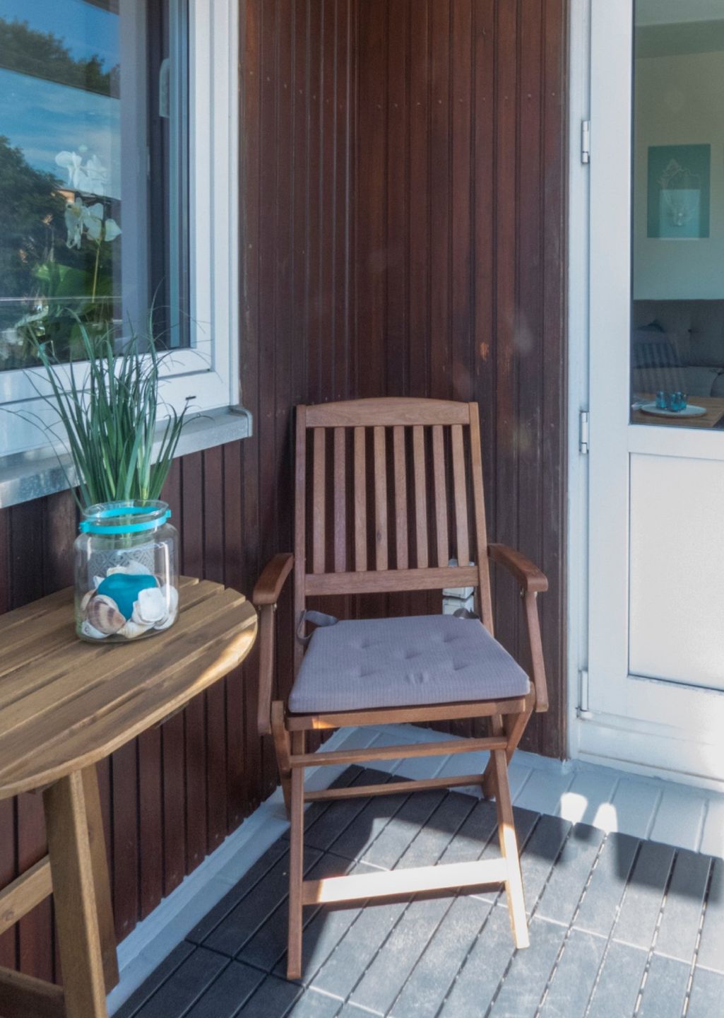 Auf dem möblierten Balkon, der vom Wohnbereich aus zugänglich ist, können Sie bei Sonnenschein schön entspannen.
