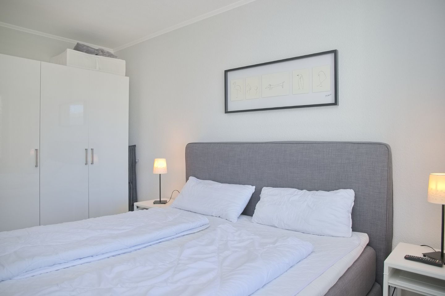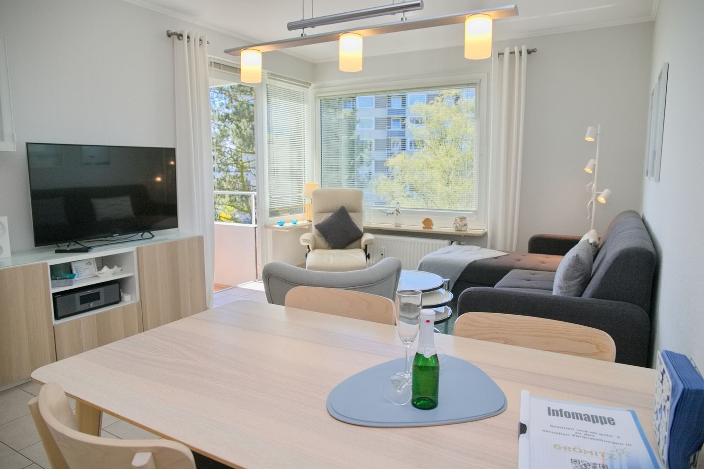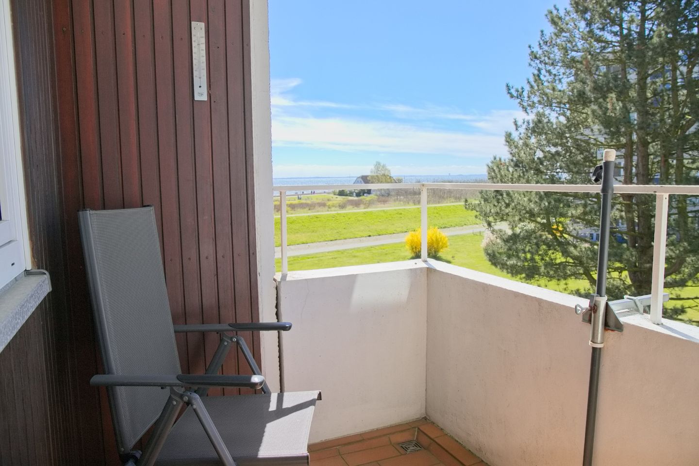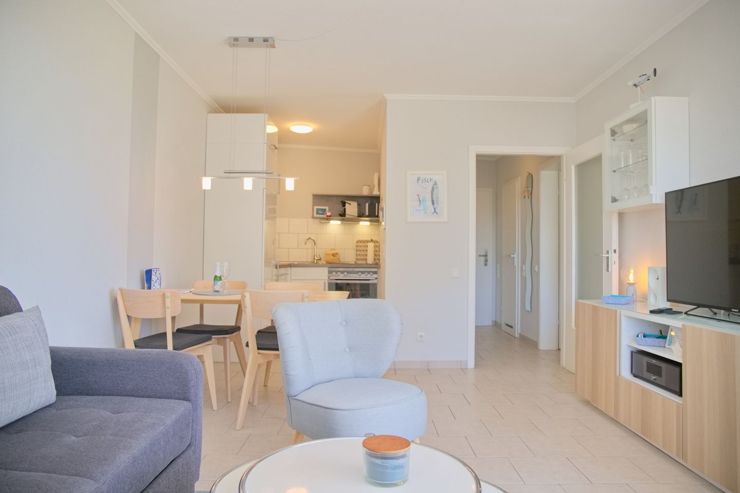 Sehr schöne 2-Zimmer-Wohnung (ca. 43 qm) für 4 Personen in der 2. Etage mit möblierten Balkon und Seeblick in Westlage. Das Wohnzimmer ist mit einem Sofa mit Schlaffunktion (Liegefläche 120 x 200 cm), einem Stressless Sessel mit Hocker, einen Flach-TV, einer Stereoanlage sowie einem Essbereich mit 4 Stühlen ausgestattet. Die offene Einbauküche verfügt über einen Geschirrspüler, einem Cerankochfeld, einem Backofen, einer Mikrowelle, ein Kühlschrank mit Gefrierfach, eine Kaffeemaschine, einer Nespresso Kapselmaschine, einem Toaster und Wasserkocher. Im Schlafzimmer stehen ein Doppelboxspringbett (durchgehender Topper, 180x200 cm), ein Flach-TV und ein Kleiderschrank zur Verfügung. Freundliches helles Duschbad mit Rainshower, WC, Waschtisch und Fön.