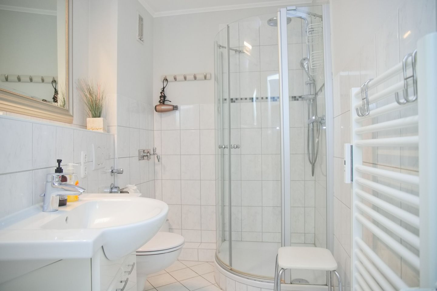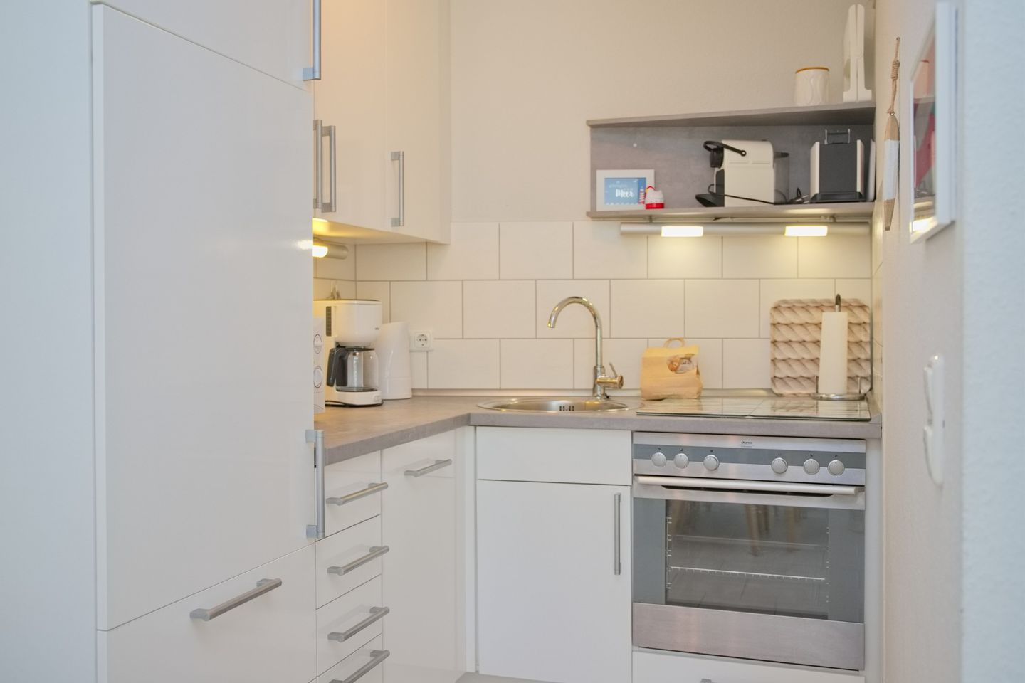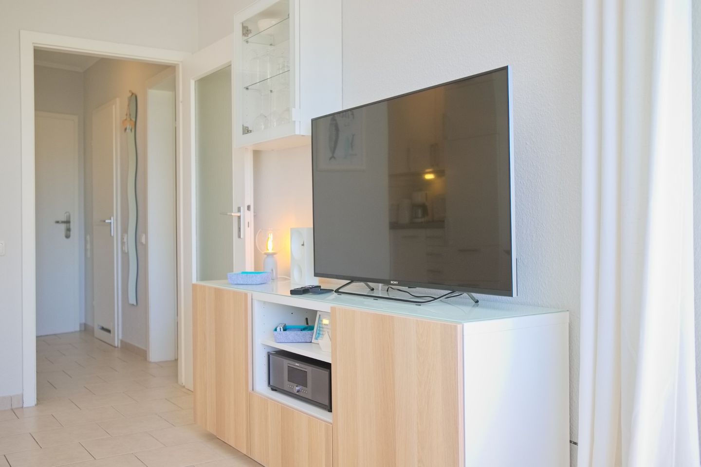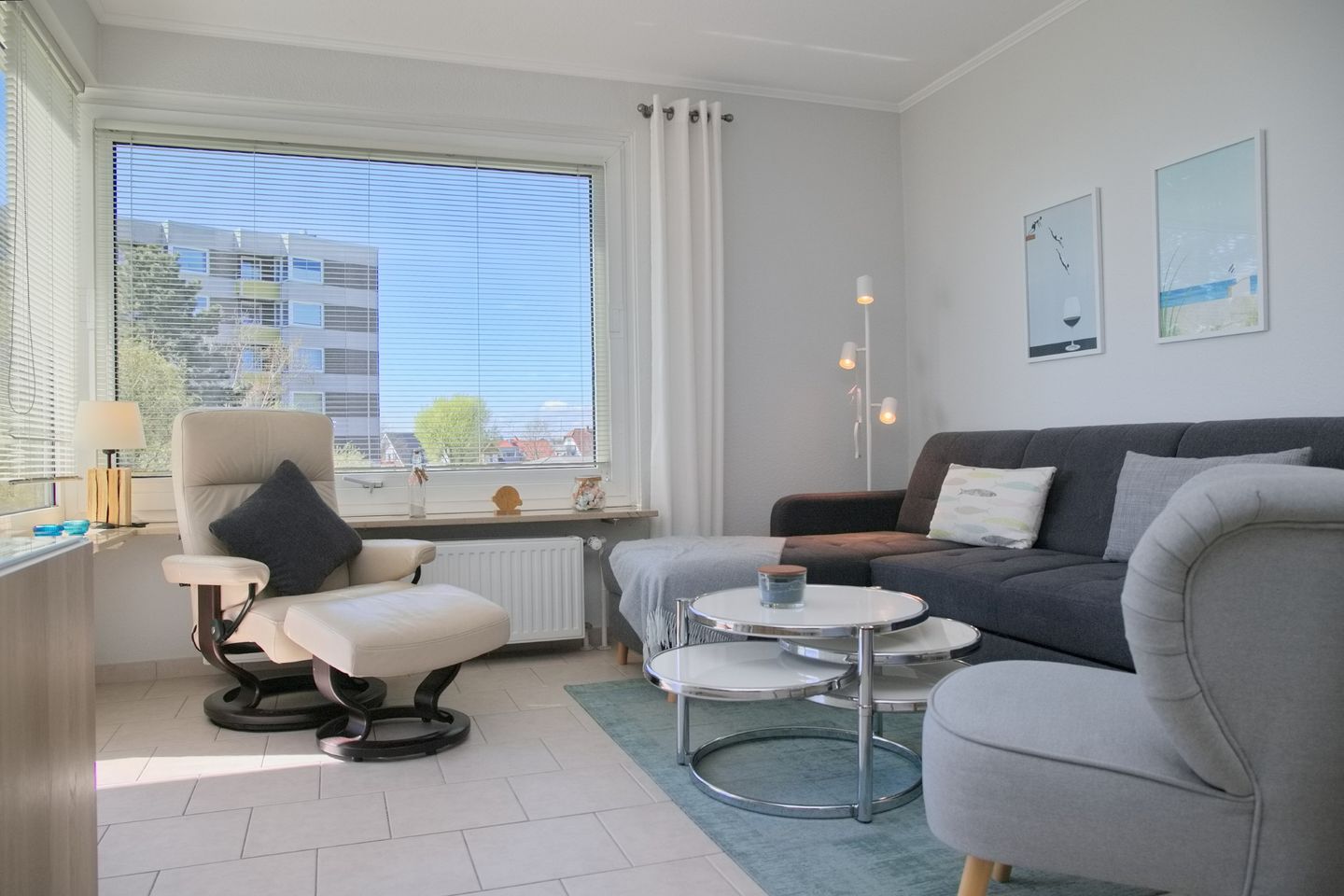 Sehr schöne 2-Zimmer-Wohnung (ca. 43 qm) für 4 Personen in der 2. Etage mit möblierten Balkon und Seeblick in Westlage. Das Wohnzimmer ist mit einem Sofa mit Schlaffunktion (Liegefläche 120 x 200 cm), einem Stressless Sessel mit Hocker, einen Flach-TV, einer Stereoanlage sowie einem Essbereich mit 4 Stühlen ausgestattet. Die offene Einbauküche verfügt über einen Geschirrspüler, einem Cerankochfeld, einem Backofen, einer Mikrowelle, ein Kühlschrank mit Gefrierfach, eine Kaffeemaschine, einer Nespresso Kapselmaschine, einem Toaster und Wasserkocher. Im Schlafzimmer stehen ein Doppelboxspringbett (durchgehender Topper, 180x200 cm), ein Flach-TV und ein Kleiderschrank zur Verfügung. Freundliches helles Duschbad mit Rainshower, WC, Waschtisch und Fön.
