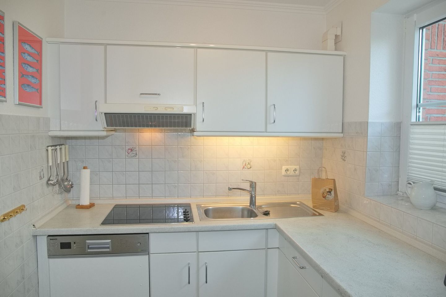 Die angrenzende Einbauküche lässt keine Wünsche offen und verfügt über ein Cerankochfeld mit vier Platten, Geschirrspüler, einen geräumigen Kühlschrank mit Gefrierfach, Mikrowelle, Kaffeemaschine, Toaster und Wasserkocher.