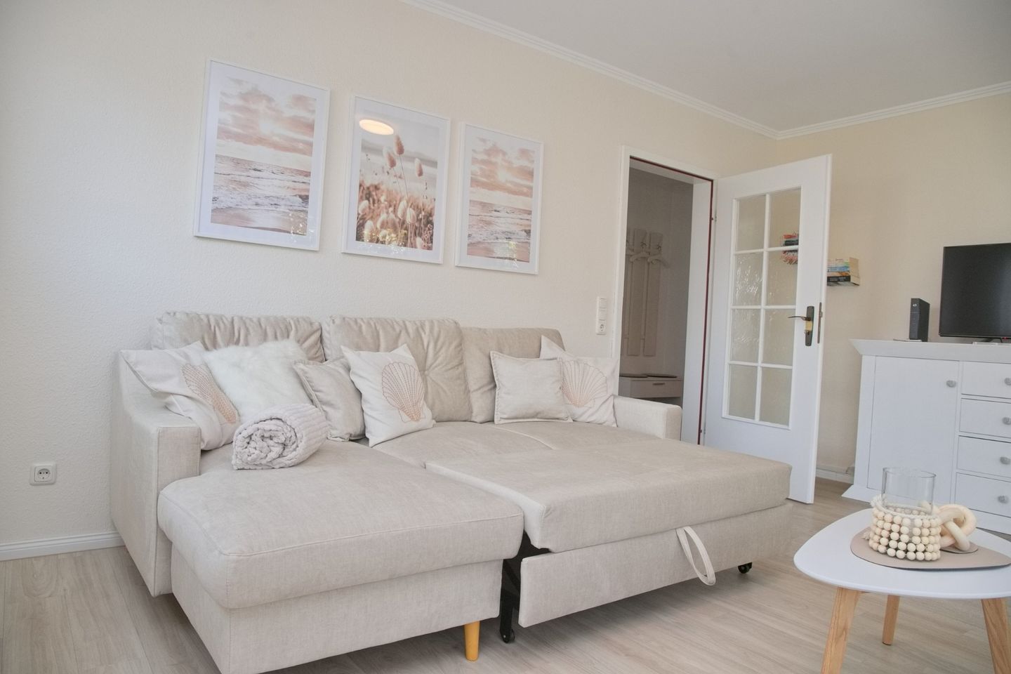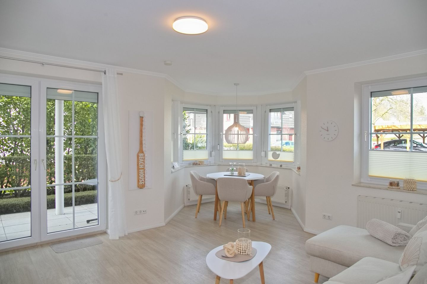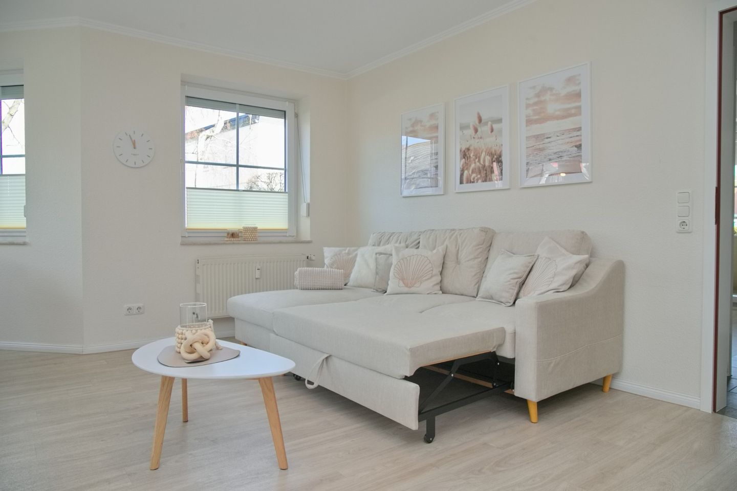 Das Wohnzimmer beherbergt eine gemütliche Schlafcouch und einen modernen Flatscreen-Fernseher. Der Essbereich im Erker lädt mit vier bequemen Stühlen zum geselligen Beisammensein ein. Von hier aus gelangen Sie auch auf die Terrasse, die sich ideal für einen entspannten Start oder Ausklang des Tages eignet.