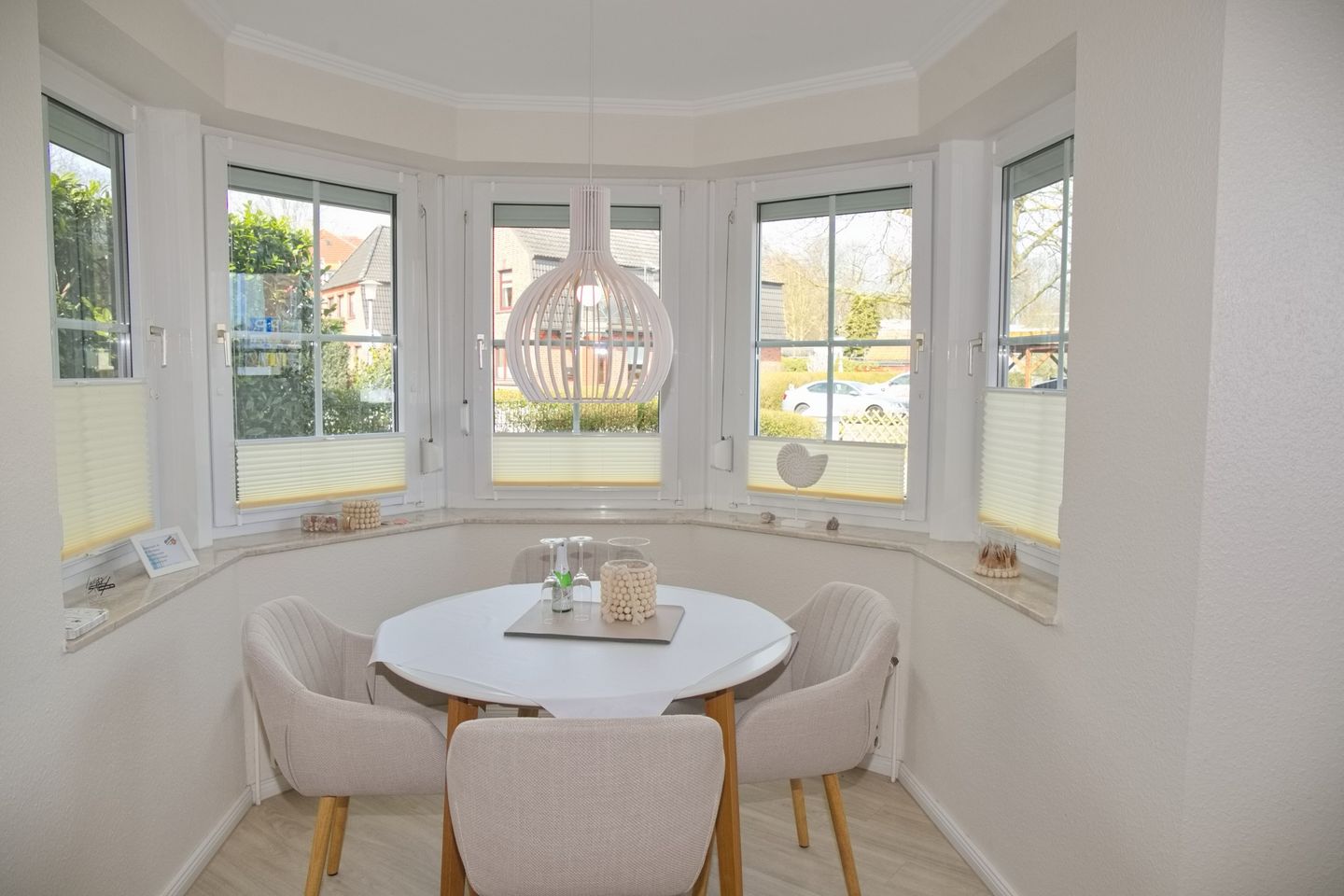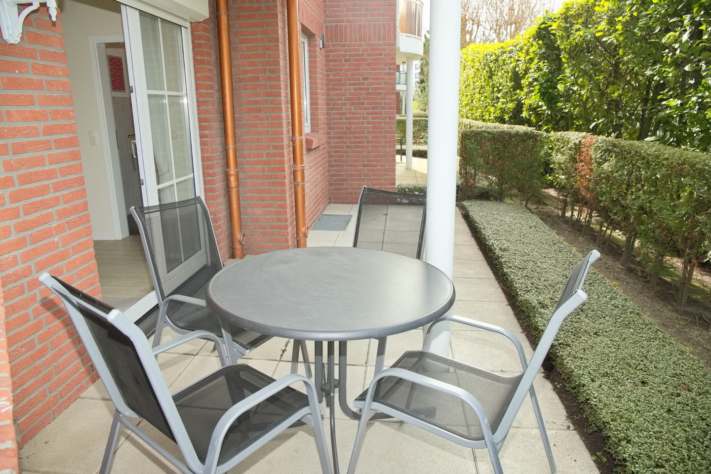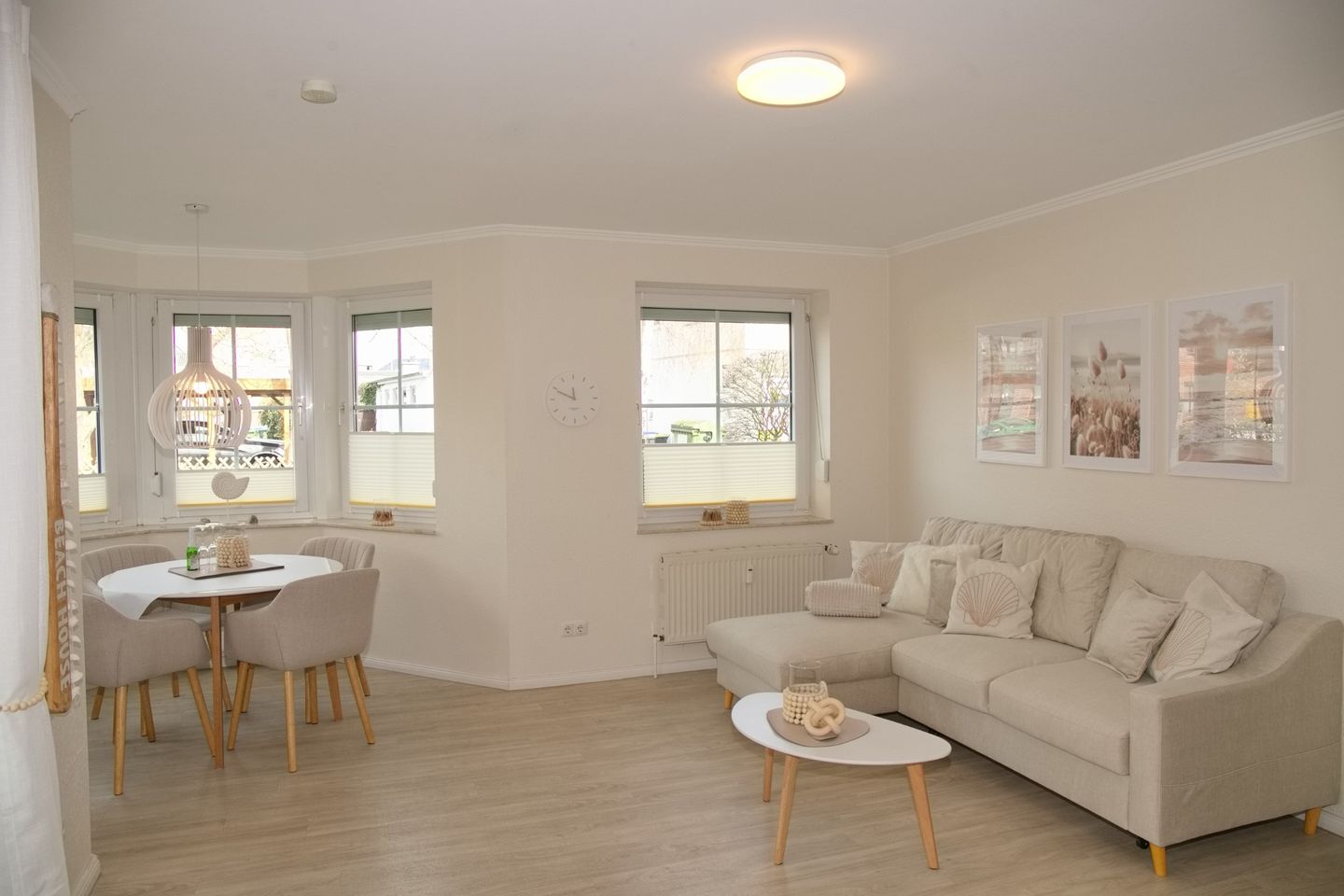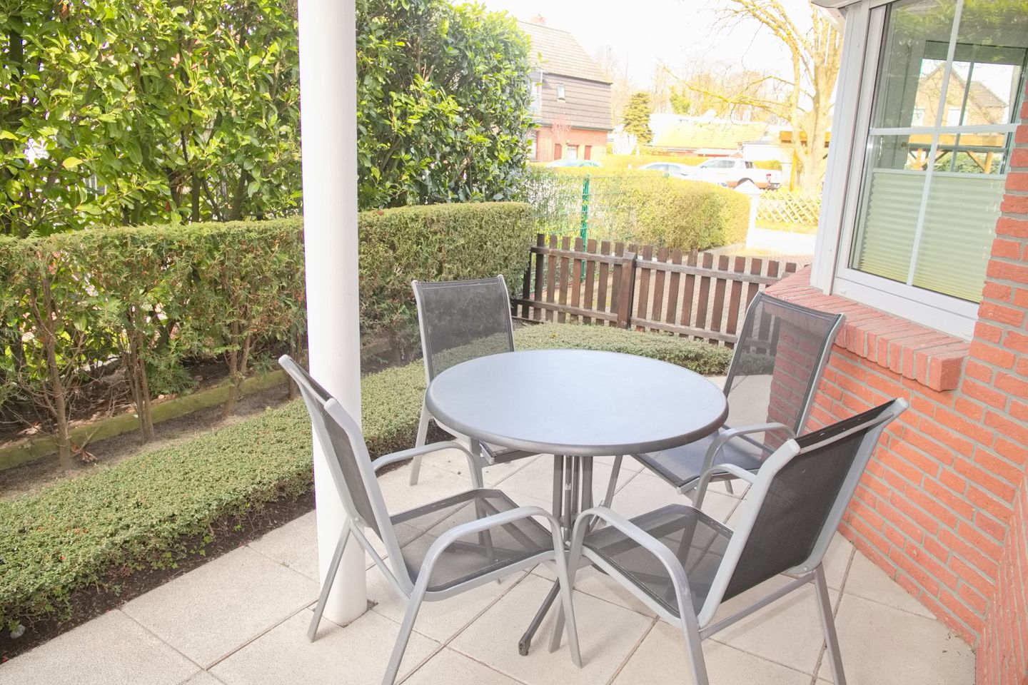 Das Wohnzimmer beherbergt eine gemütliche Schlafcouch und einen modernen Flatscreen-Fernseher. Der Essbereich im Erker lädt mit vier bequemen Stühlen zum geselligen Beisammensein ein. Von hier aus gelangen Sie auch auf die Terrasse, die sich ideal für einen entspannten Start oder Ausklang des Tages eignet.