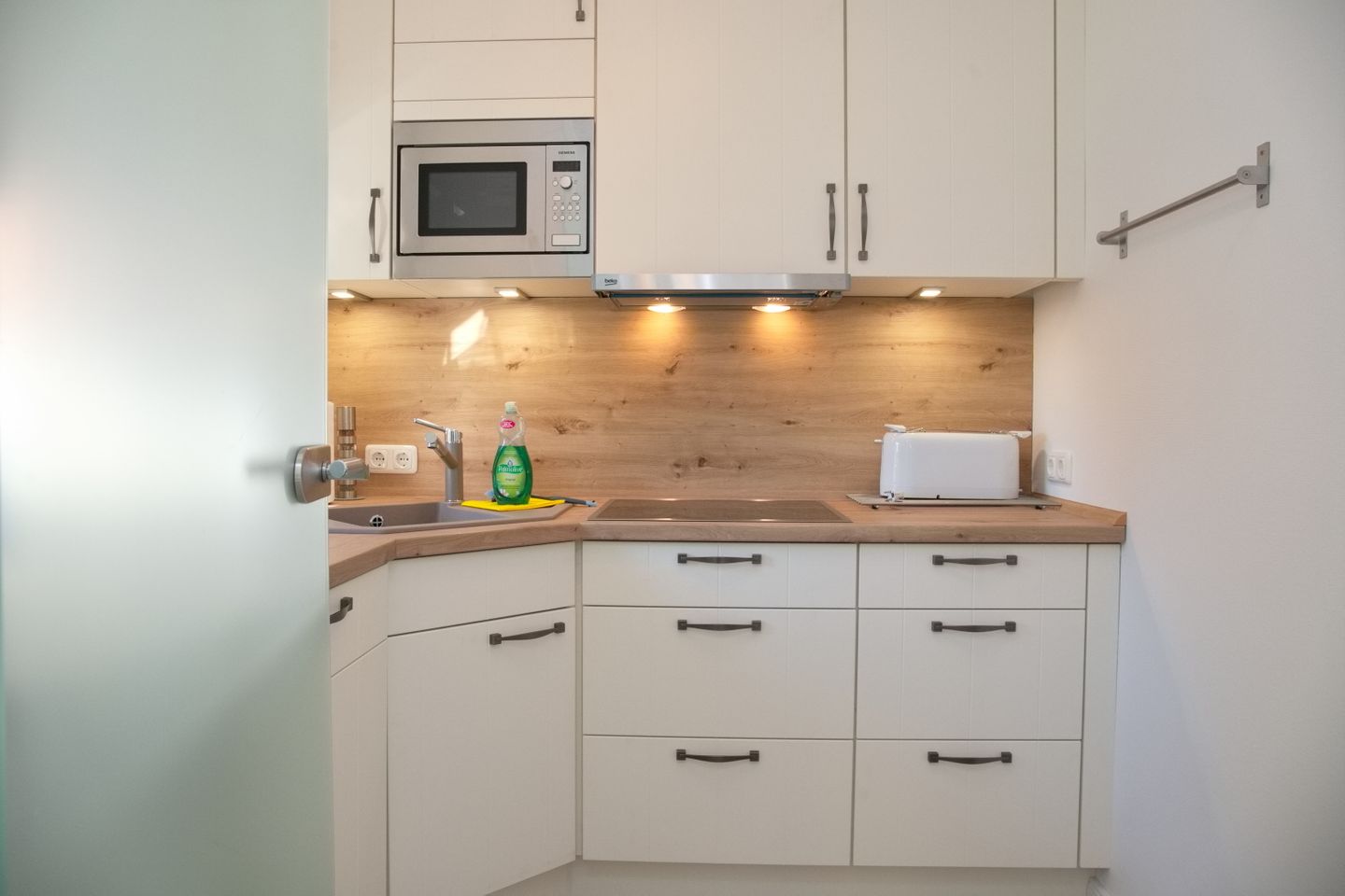 Die geschlossene Küche ist komplett ausgestattet und lädt dazu ein, Ihre Lieblingsgerichte zuzubereiten. Sie finden hier einen Cerankochfeld-Herd, einen Kühlschrank mit Gefrierfach, eine Mikrowelle sowie eine Kaffeemaschine, Toaster und Geschirrspüler. Genießen Sie Ihre Mahlzeiten am großen Esstisch oder draußen auf dem möblierten Balkon, während Sie den Blick auf die Umgebung schweifen lassen.