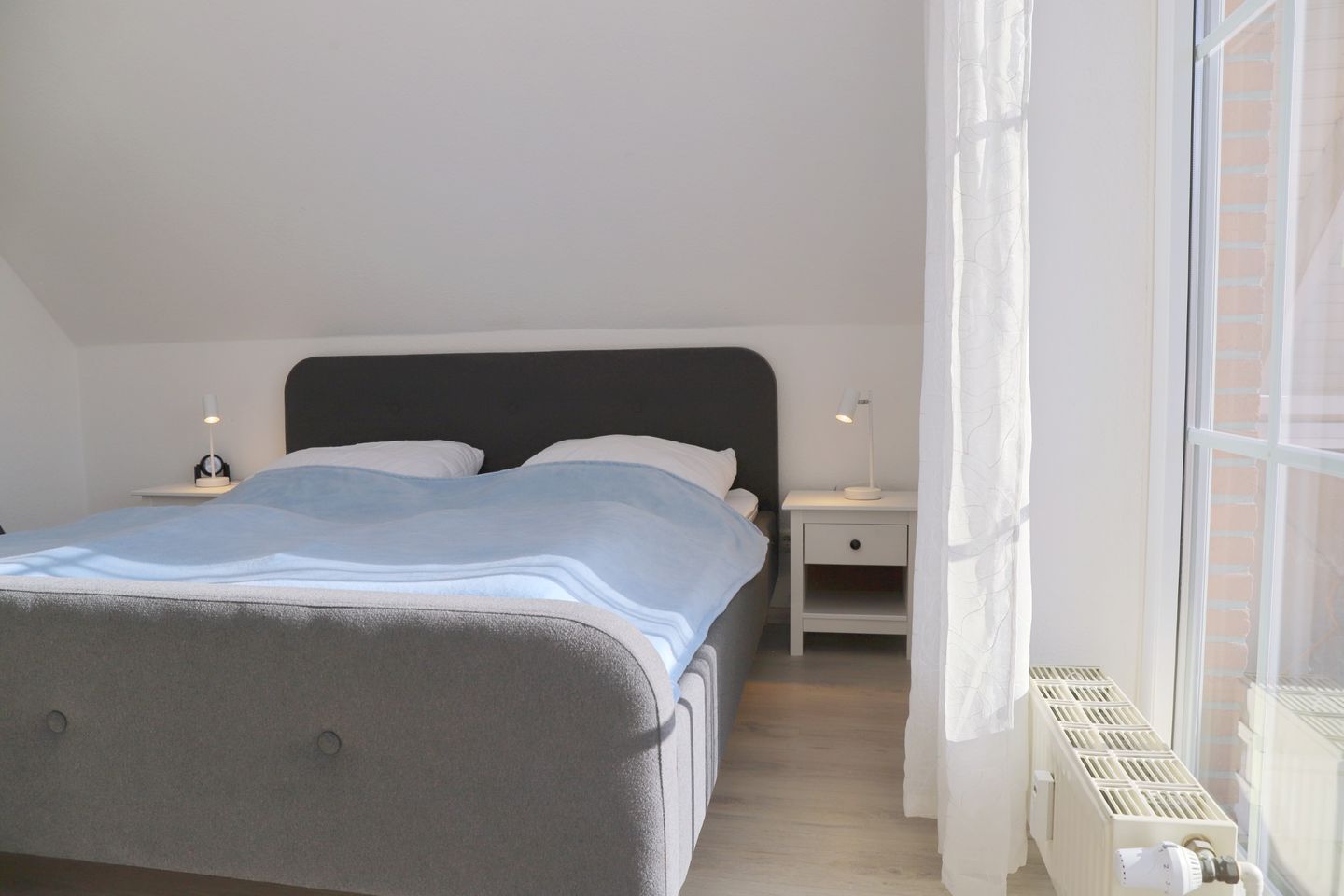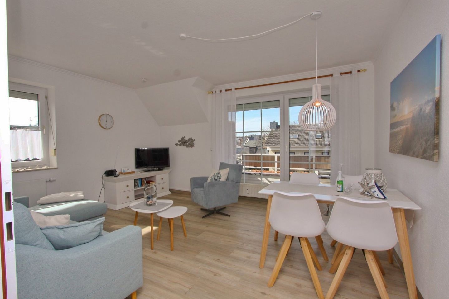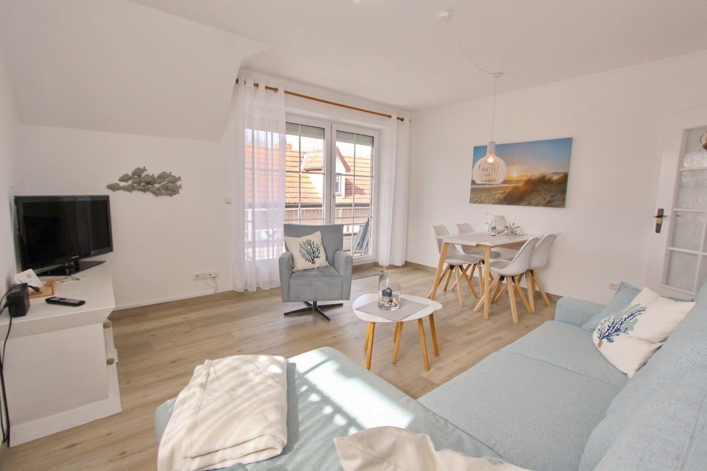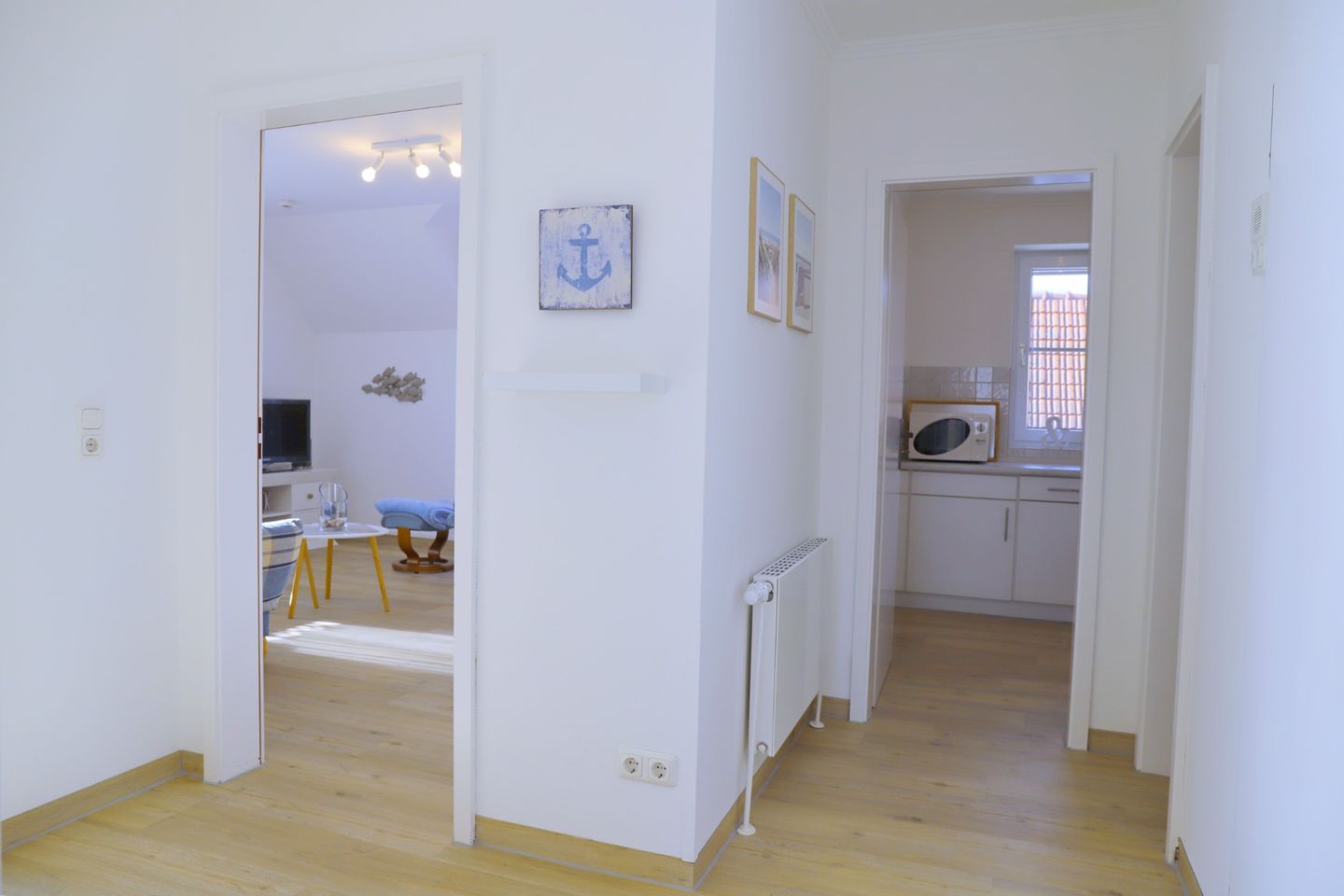 Die Ferienwohnung erstreckt sich über ca. 53 Quadratmeter im 2. Obergeschoss und bietet Platz für bis zu drei Personen. Alle Räumlichkeiten befinden sich auf einer Ebene. Bereits beim Betreten des Dielenbereichs finden Sie ausreichend Platz für Ihre Garderobe und Schuhe. Der Wohnbereich ist lichtdurchflutet und gemütlich gestaltet. Der Essbereich wurde geschickt in den Wohnraum integriert, und die separate weiße Küche verwöhnt Sie mit allem Kochkomfort.