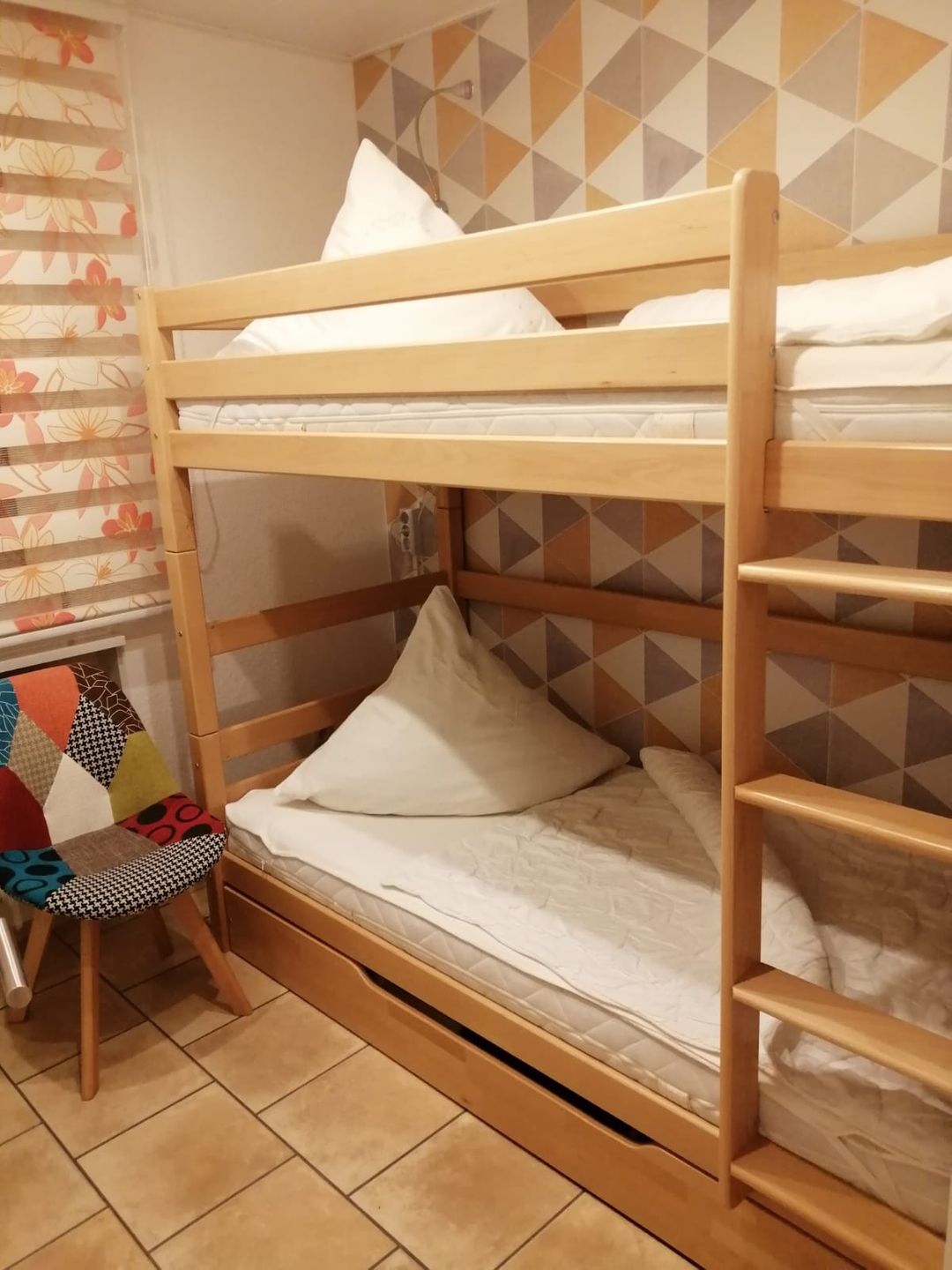 Die Ferienwohnung verfügt über zwei separate Schlafzimmer. Das Elternschlafzimmer ist mit einem komfortablen Doppelbett (2 x 80 x 200 cm), verstellbaren Lattenrosten, einem geräumigen Kleiderschrank und einem Verdunkelungsrollo ausgestattet und bietet beste Voraussetzungen für erholsamen Schlaf. Das zweite Schlafzimmer verfügt über ein Etagenbett (90 x 200 cm), einen Kleiderschrank sowie ebenfalls ein Verdunkelungsrollo – ideal für Familien mit Kindern.