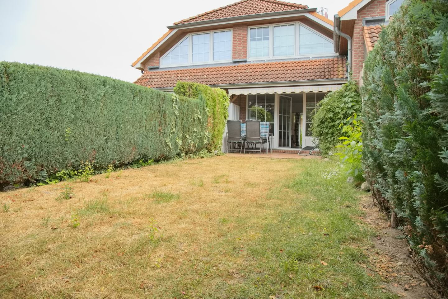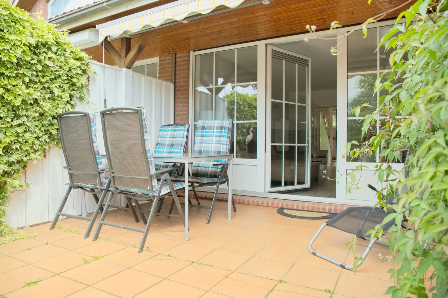 Die zum Teil überdachte Terrasse ist möbliert und verfügt außerdem über eine Markise. Genießen Sie ein ausgiebiges Frühstück oder die herrlichen Sonnenstrahlen. Der Garten ist teilweise eingezäunt. Rundum ist eine Hecke angelegt worden.