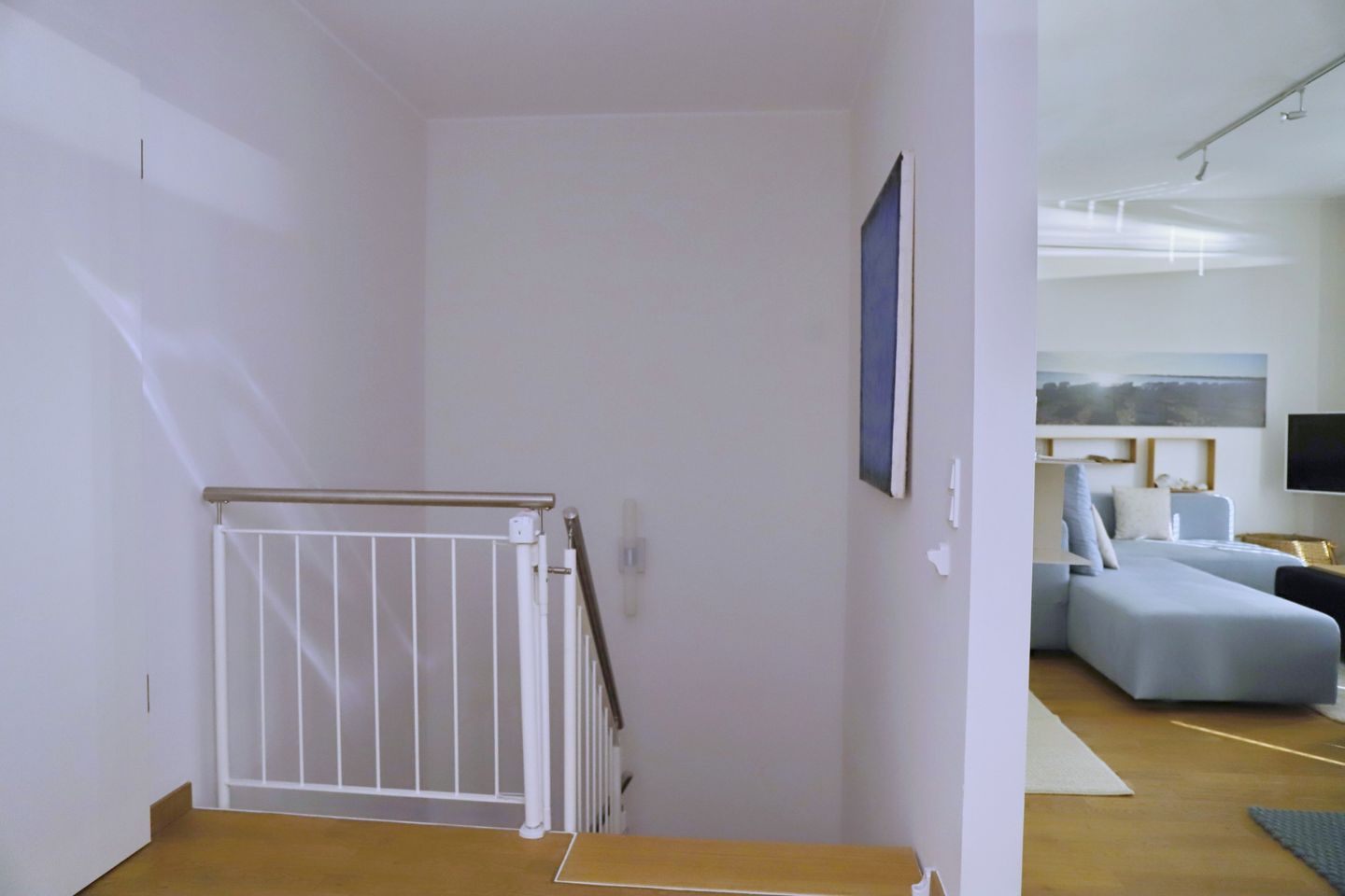 Die offene hochwertige Einbauküche ist gut ausgestattet mit einem Induktionskochfeld, einem Backofen in Komfort höhe, einer Geschirrspülmaschine, einem Toaster, einer Kaffeemaschine, einer Nespresso Maschine, Mikrowelle, einem Wasserkocher und einer Kühl- Gefrierkombi.