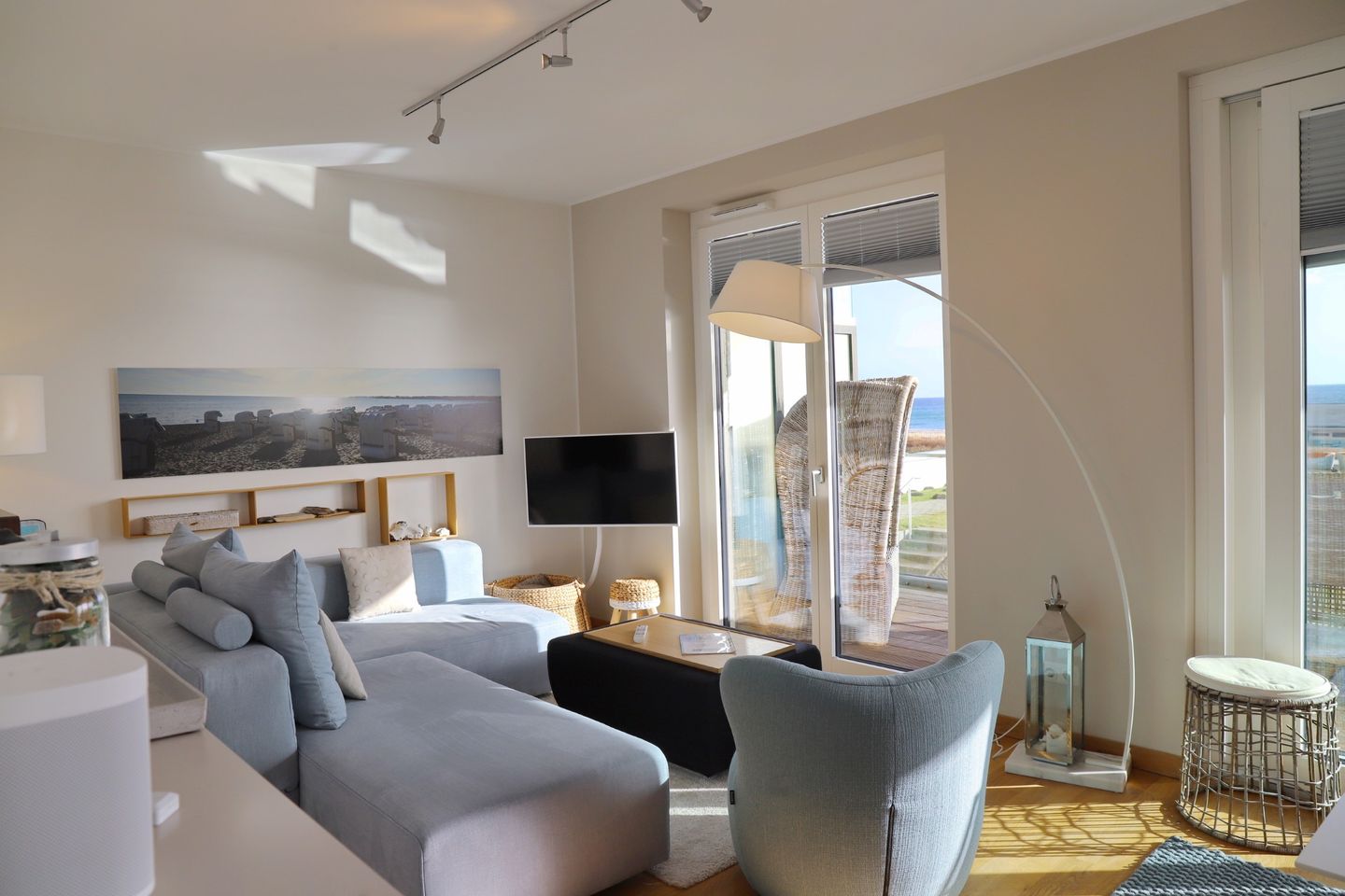 Über eine Wendeltreppe gelangen Sie in das Untergeschoss. Hier finden Sie das Schlafzimmer mit Doppelbett und einem weiteren Flachbild- TV. Die möblierte Terrasse mit Strandkorb ist über das Schlafzimmer zu erreichen und bietet einen eigenen Strandzugang über die Steintreppe.