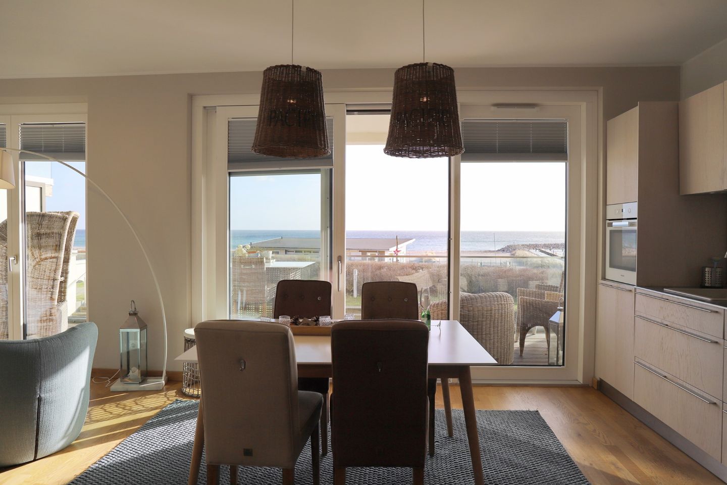 Der Essbereich, welcher bedacht an der großen Fensterfront seinen Platz gefunden hat, trennt den Wohn- und Kochbereich. Genießen Sie denn Seeblick schon beim ausgiebigen Frühstück.