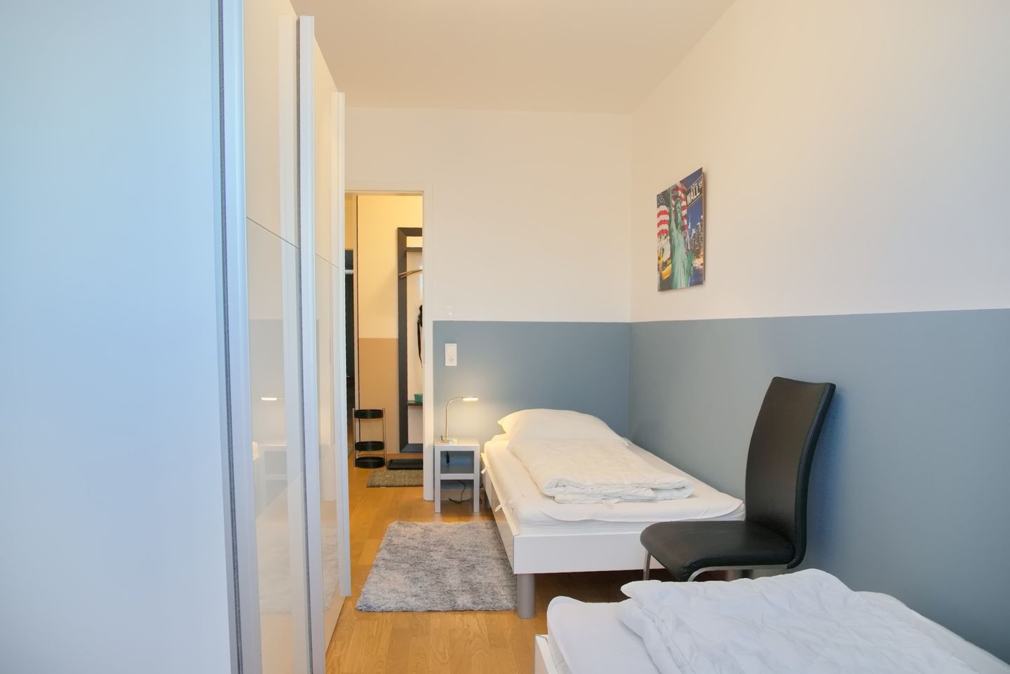 Zu Ihrer Linken finden Sie das erste Schlafzimmer mit zwei Einzelbetten und einem Kleiderschrank. Das zweite Schlafzimmer ist direkt daneben und bietet Ihnen ein Doppelbett, Flach TV und ein Kleiderschrank.