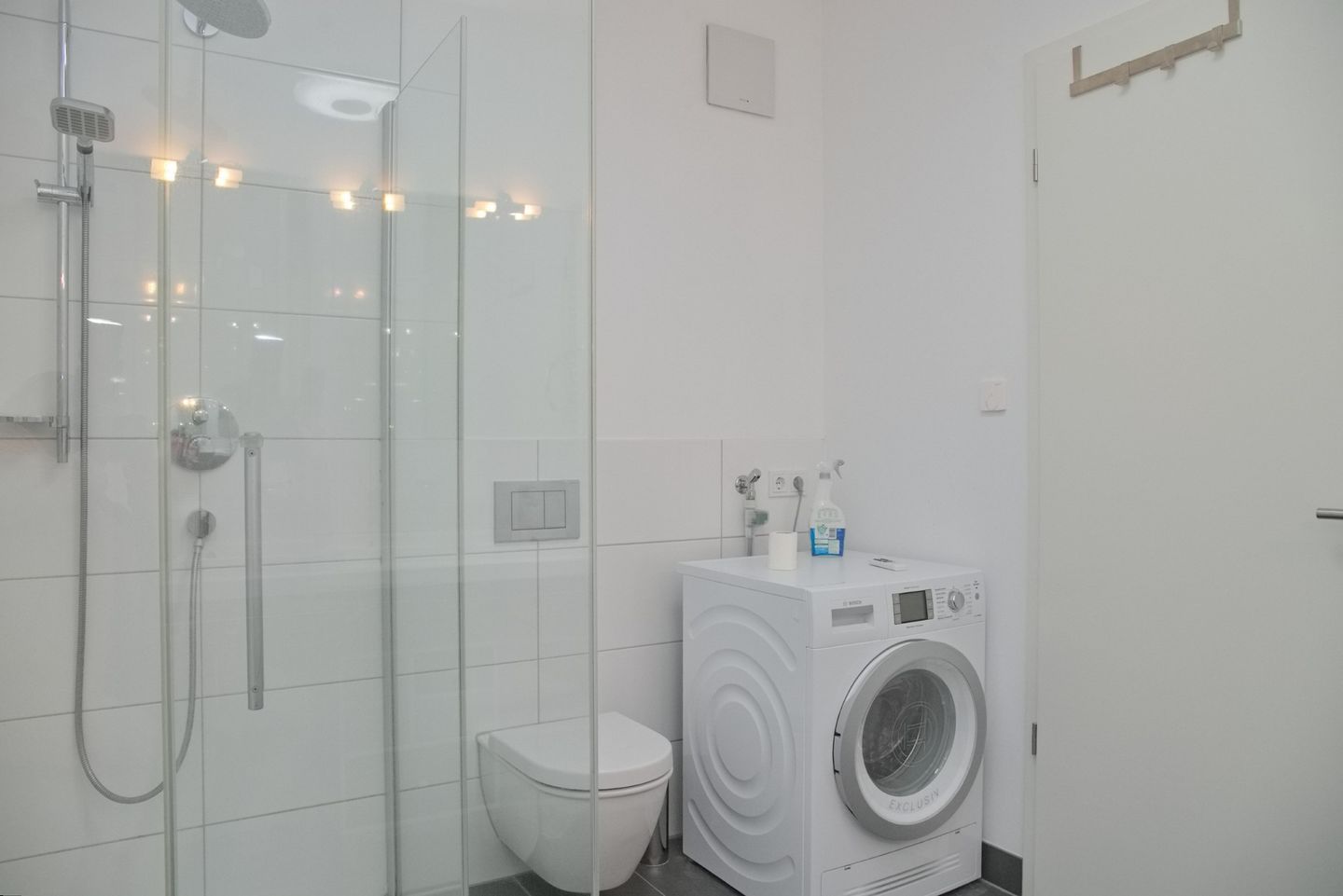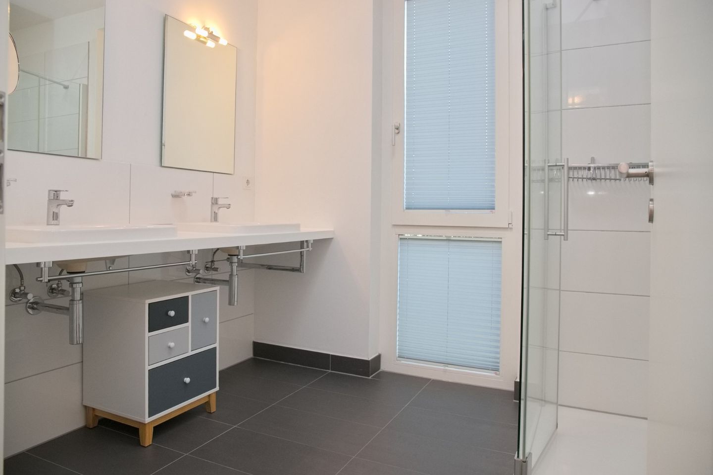 Zurück auf den Flur kommen Sie in das große Bad mit Tageslicht, bodengleicher Dusche, wandhängendem WC, Doppelwaschtisch, Spiegel und Waschtrockner. Ein Gäste WC ist ebenfalls in der Wohnung vorhanden.