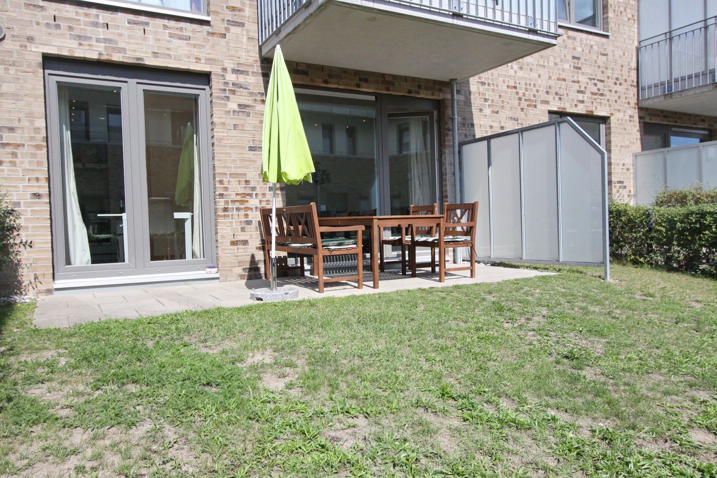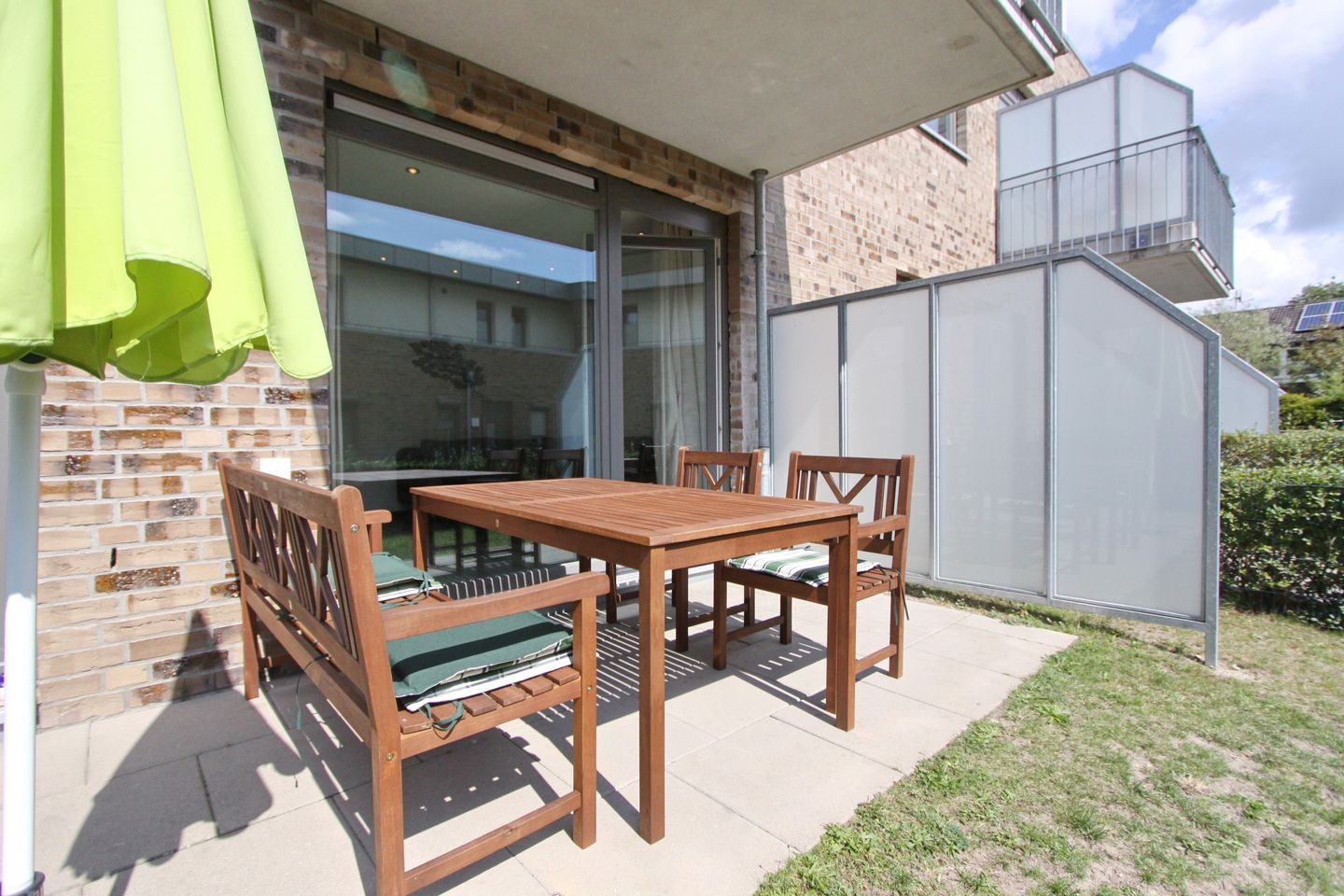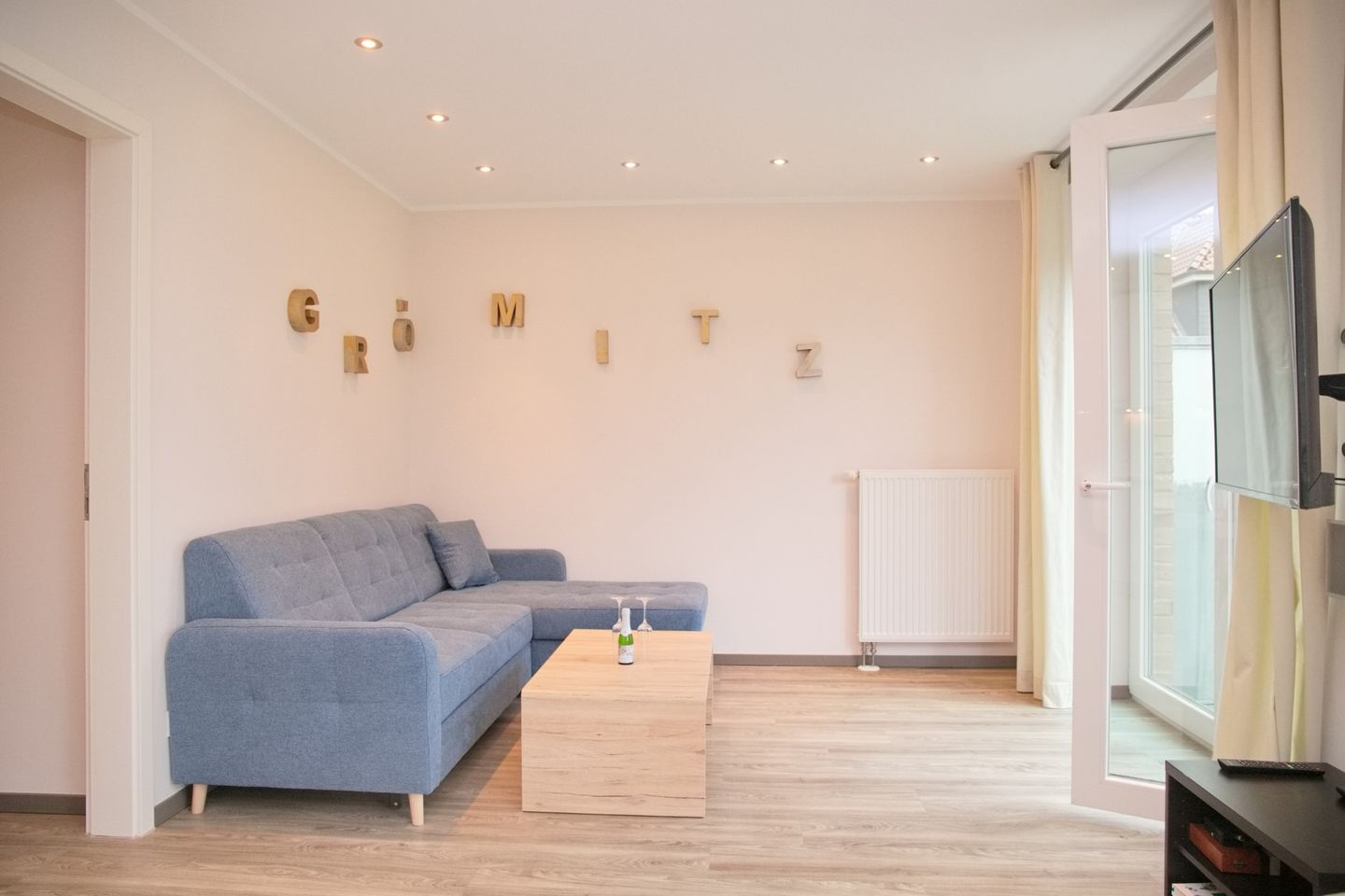 Das in Natur tönen gehaltene und mit Planken ausgelegten Wohnzimmer verfügt über eine gemütliche Eckcouch, einen Flach-TV,einen Essbereich für 4 Personen sowie die offene Einbauküche. Die schicke Küche ist ausgestattet mit einem Cerankochfeld, eine Dunstabzugshaube, einem Backofen, einem Kühlschrank mit Gefrierfach, einem Geschirrspüler und einer Kombi-Kaffeemaschine/Wasserkocher/Toaster.