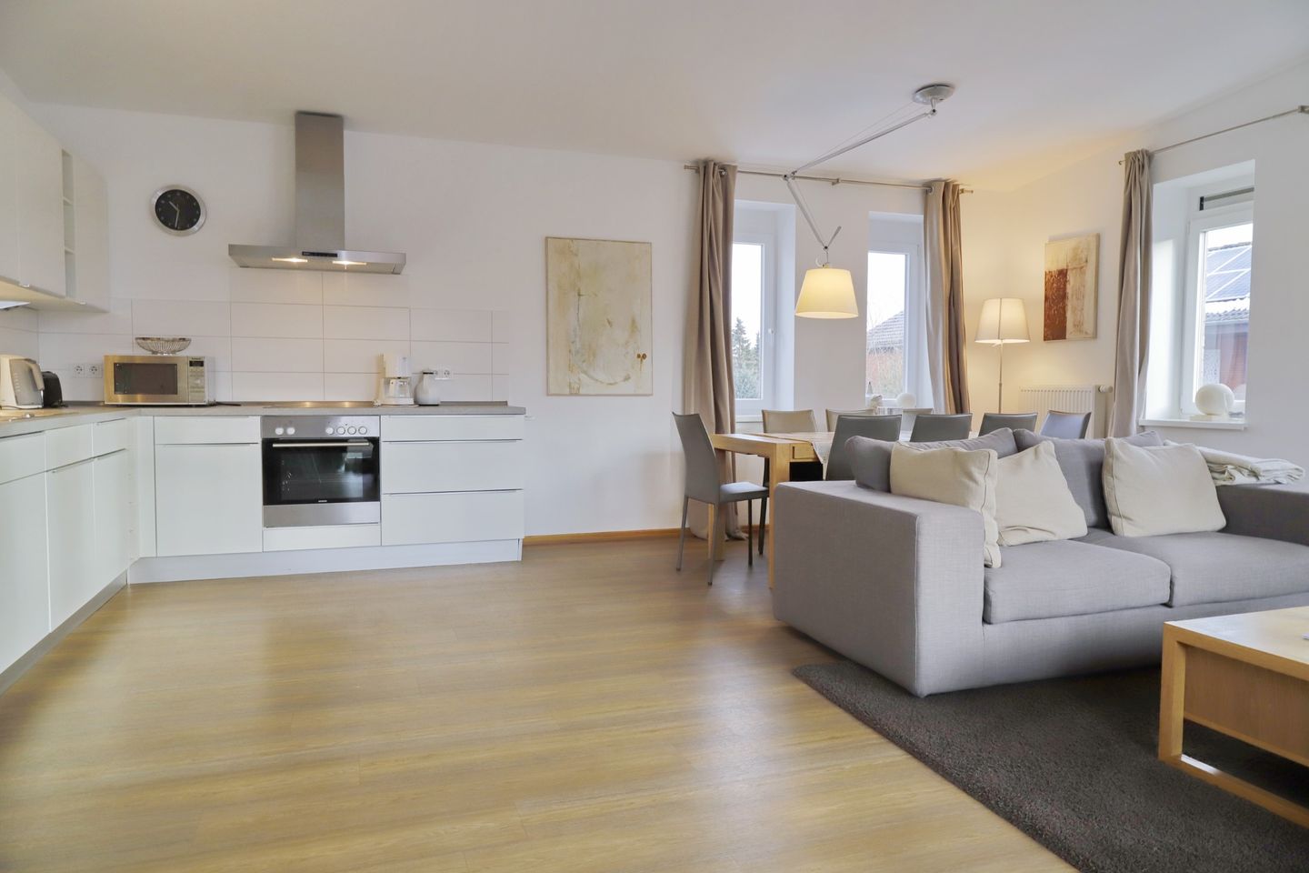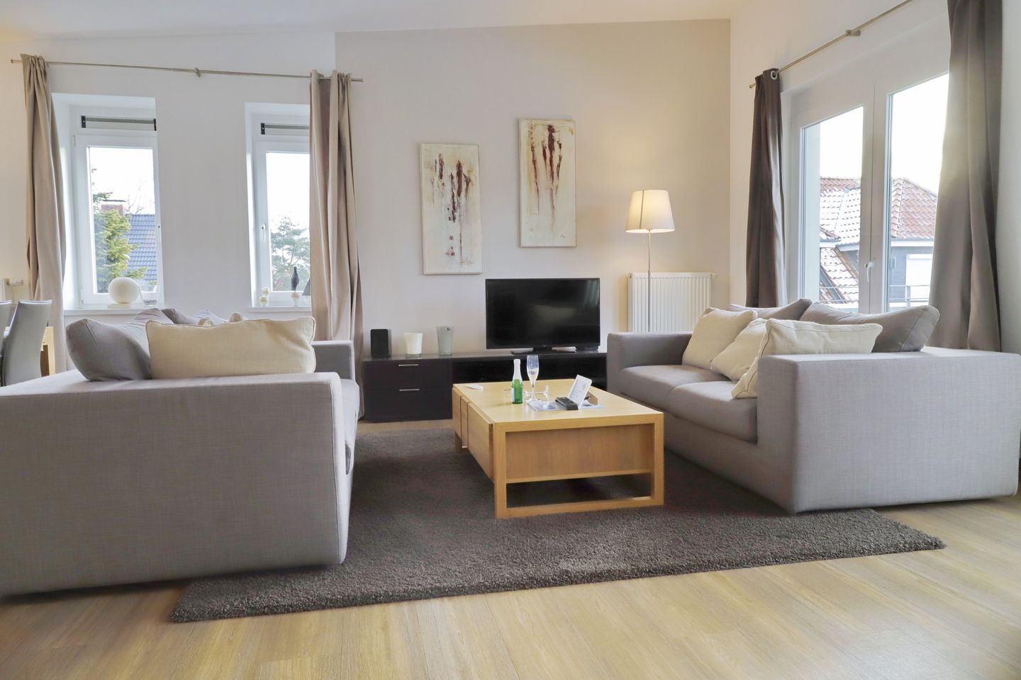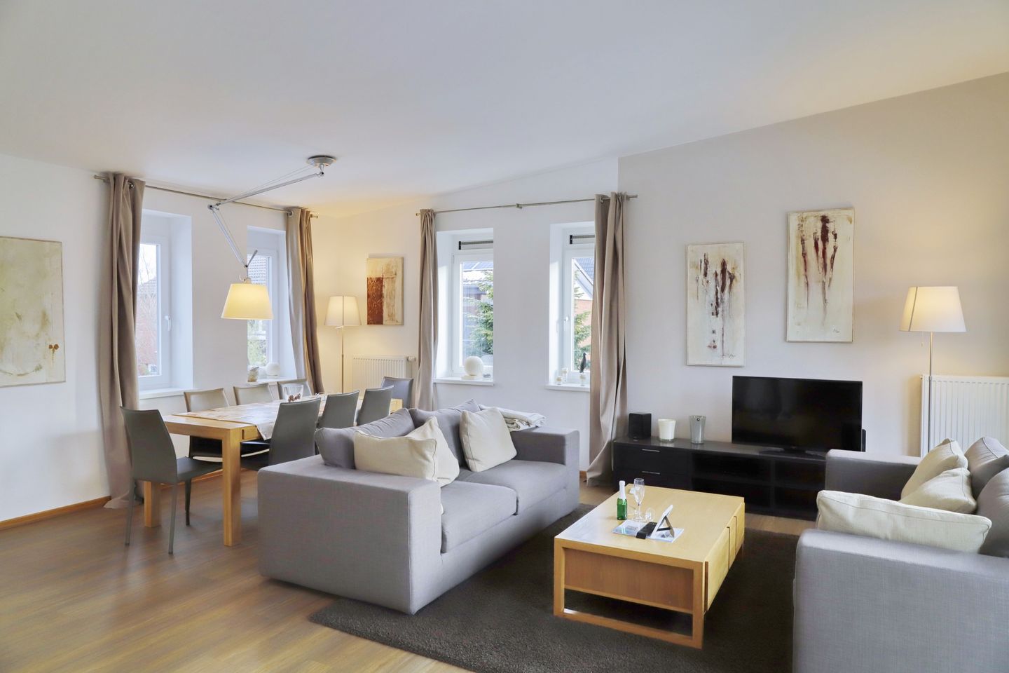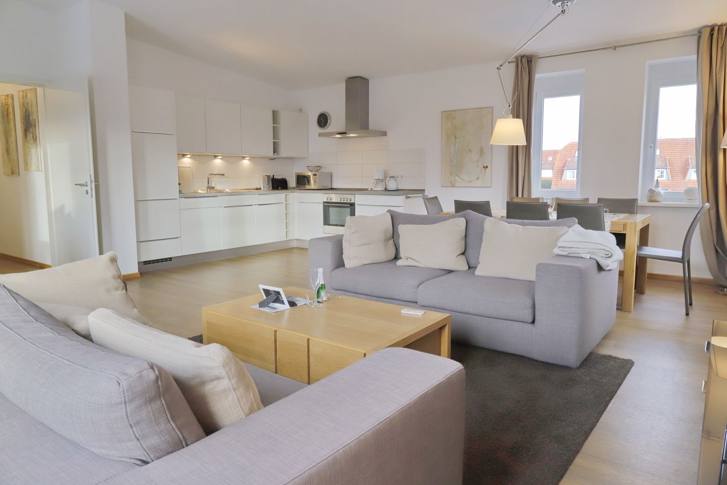 Herzlich willkommen in dieser geräumigen Ferienwohnung, die sich auf der 1. Etage einer gepflegten Wohnanlage erstreckt und großzügige 100m² für Ihren erholsamen Urlaub bereithält. Die Wohnung besteht aus insgesamt 4 großzügigen Zimmern, einer offenen Küche und zwei Bädern, die Ihnen den Komfort bieten, den Sie sich für Ihre Auszeit wünschen.