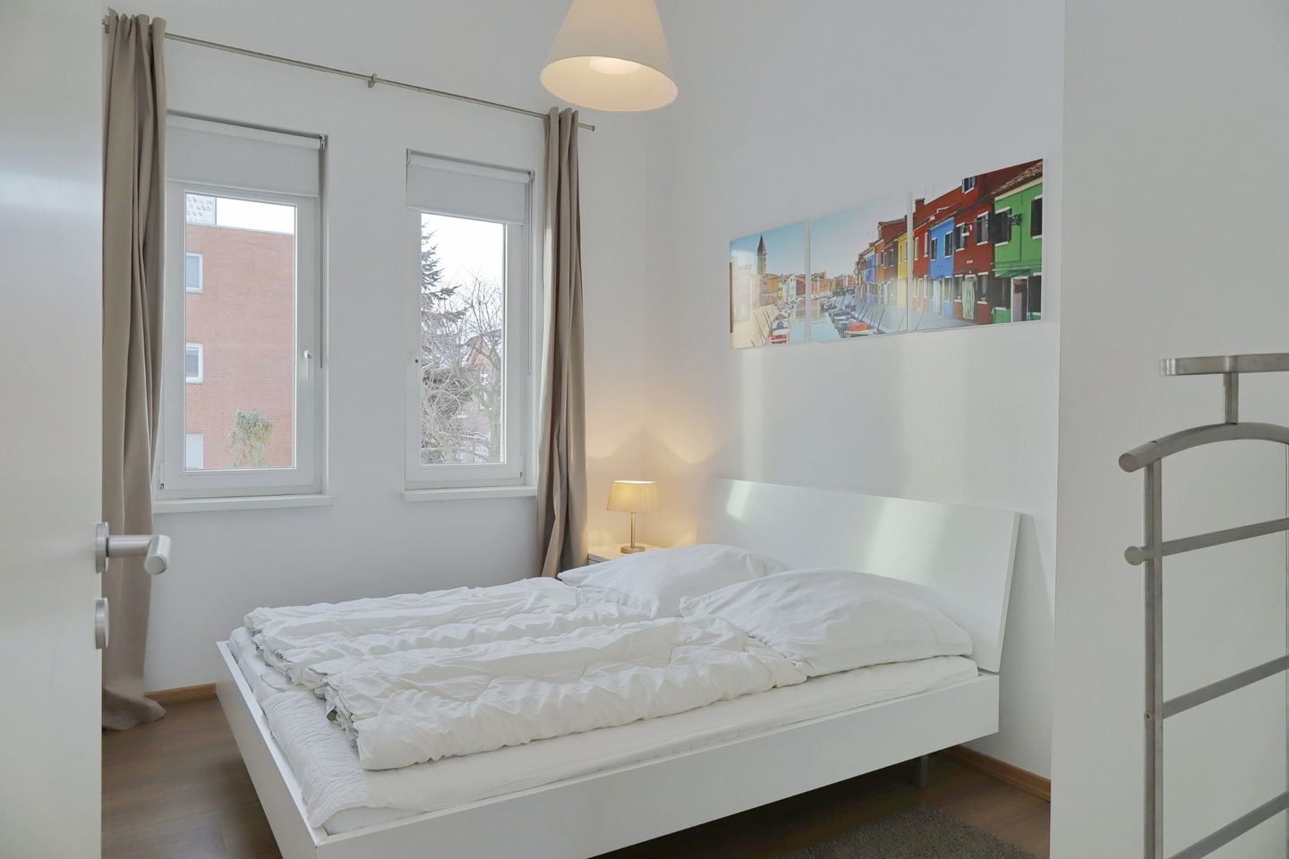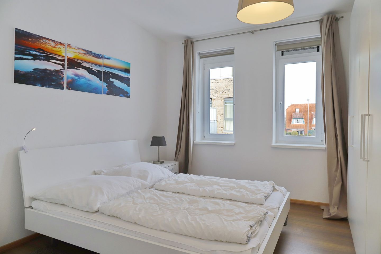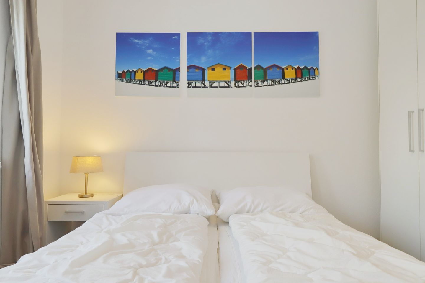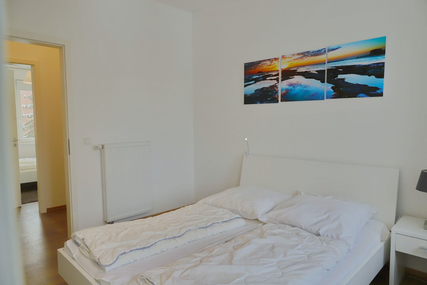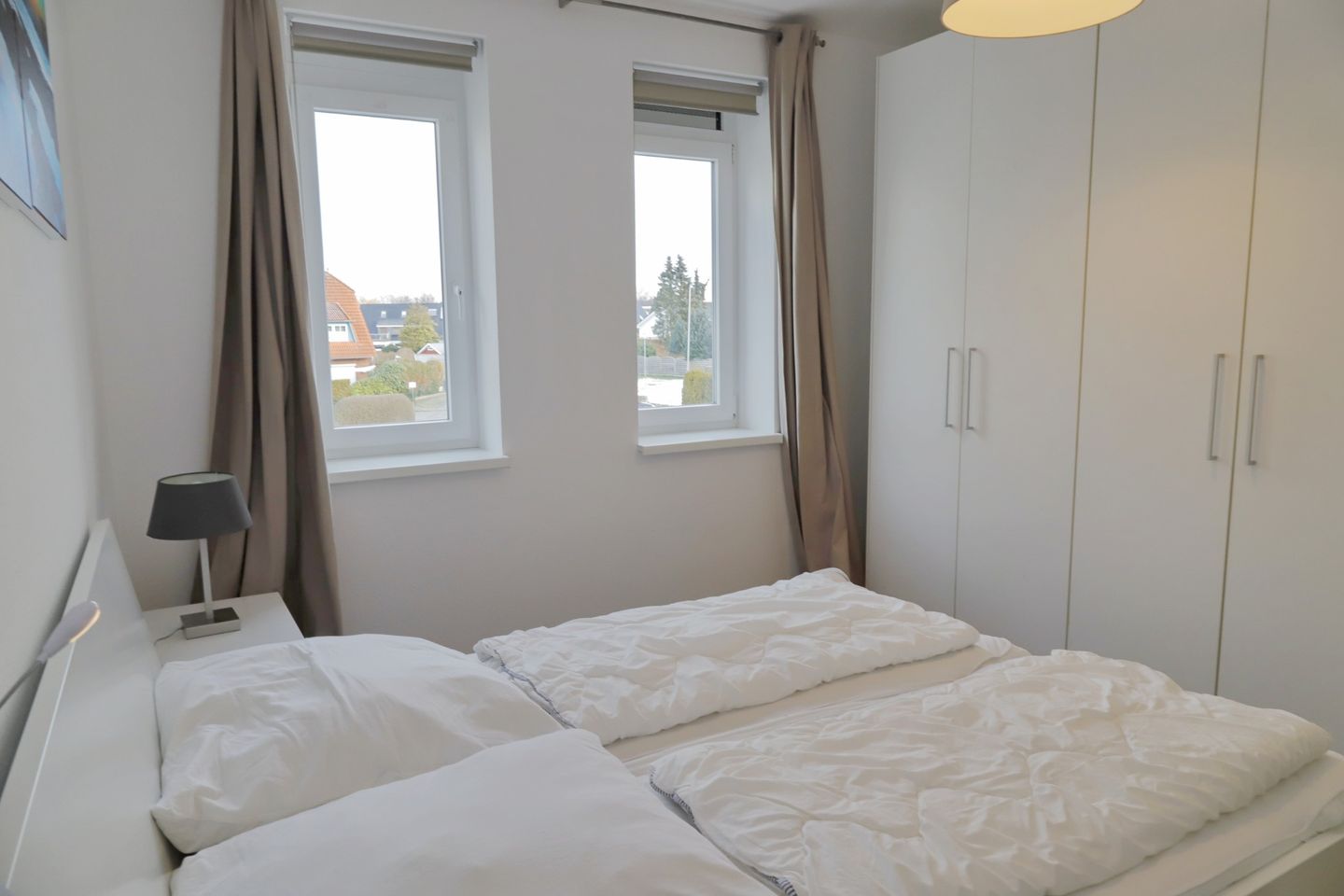 Die Ferienwohnung verfügt über drei separate Schlafzimmer, jedes ausgestattet mit einem komfortablen Doppelbett und einem geräumigen Kleiderschrank. In einem der Schlafzimmer steht zusätzlich ein weiterer Flachbild-TV für Unterhaltung bereit. Die zwei modernen Duschbäder sorgen dafür, dass alle Gäste bequem und zeitnah ihre persönliche Erfrischung finden. In einem der Bäder steht außerdem eine Waschmaschine zur Verfügung, um Ihnen den Aufenthalt so angenehm wie möglich zu gestalten.