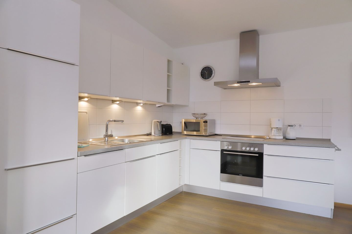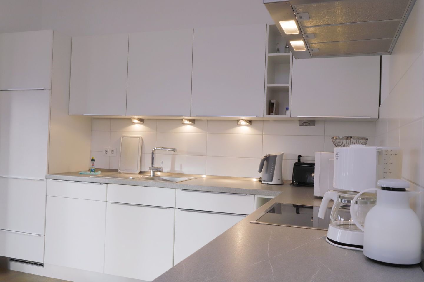 Die offene Einbauküche, direkt neben dem Wohnzimmer, ist komplett ausgestattet und lässt keine Wünsche offen. Hier finden Sie ein Cerankochfeld, einen Backofen, eine Geschirrspülmaschine, einen Kühlschrank mit Gefrierfach, einen Wasserkocher, eine Kaffeemaschine und einen Toaster. Der angrenzende Essbereich bietet ausreichend Platz für die ganze Familie, um gemeinsam zu essen und die Urlaubsmomente zu genießen.