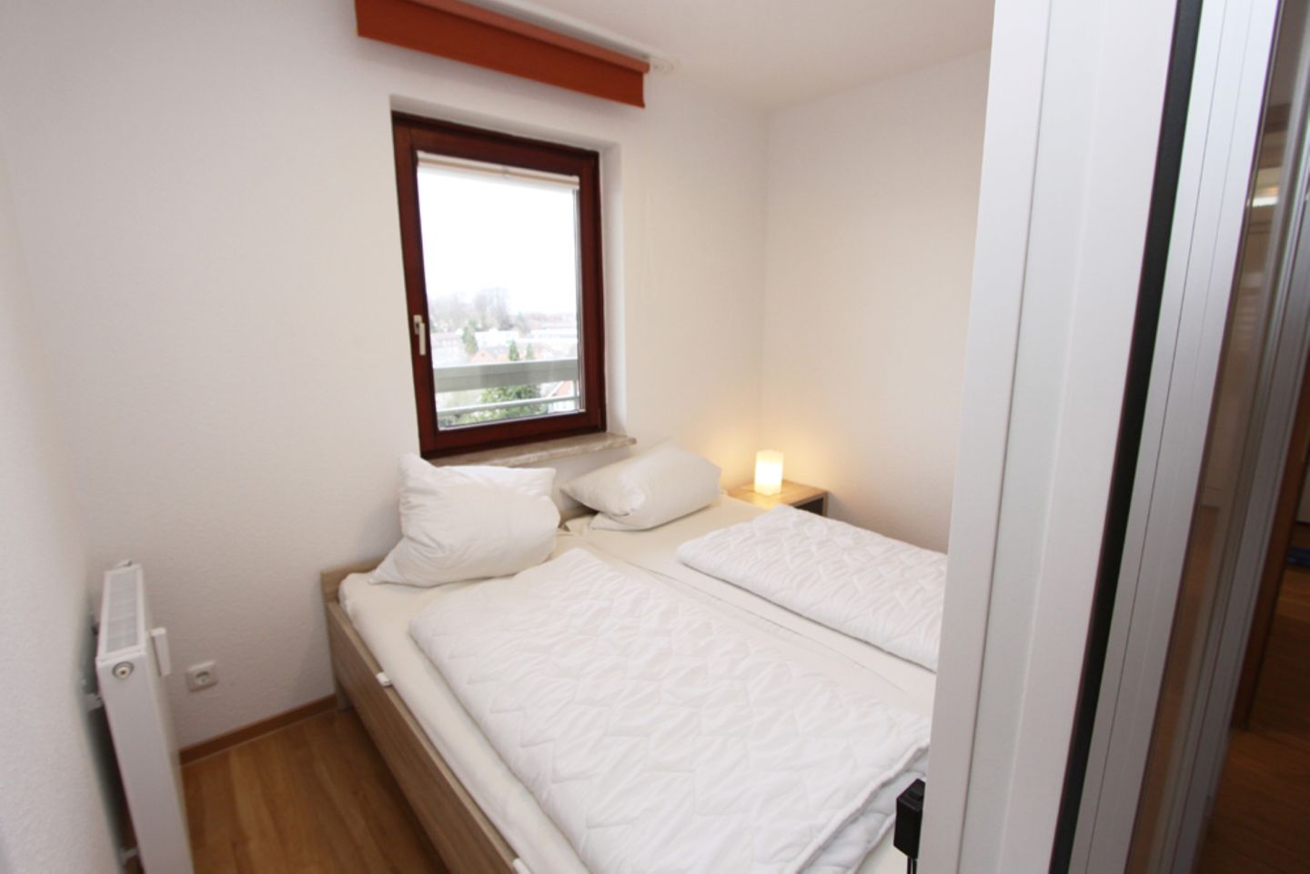 Zurück auf den Flur gelangen Sie in das separate Schlafzimmer mit Schiebetüren. Hier erwartet Sie ein Doppelbett mit Nachtisch.