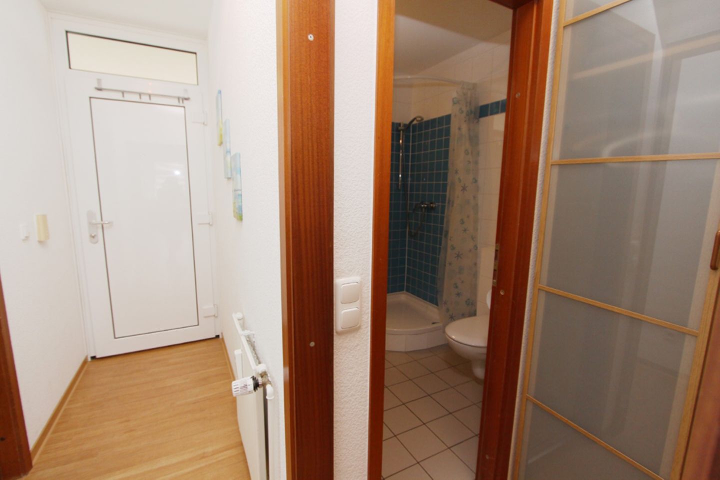Vom Flur aus haben Sie Zugang zu dem Bad mit Dusche, WC, Waschbecken und Fenster.
