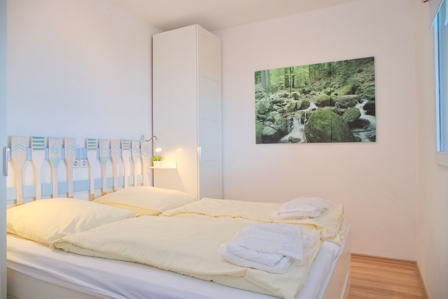 Das Schlafzimmer verfügt über ein komfortables Doppelbett (2x90x200 cm) und einen geräumigen Kleiderschrank. Ein Fenster zum Wohnzimmer hin sorgt für eine angenehme Atmosphäre.