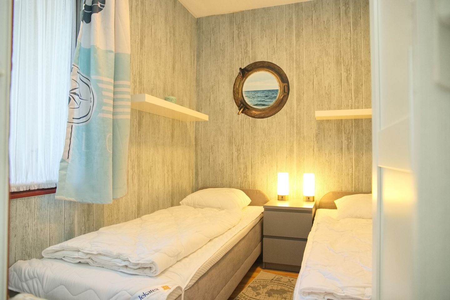 Im Kinderzimmer stehen zwei auseinander stehende Einzelbettboxspringbetten sowie ein Kleiderschrank zur Verfügung. Eine Schiebetür ermöglicht eine flexible Nutzung des Raumes.