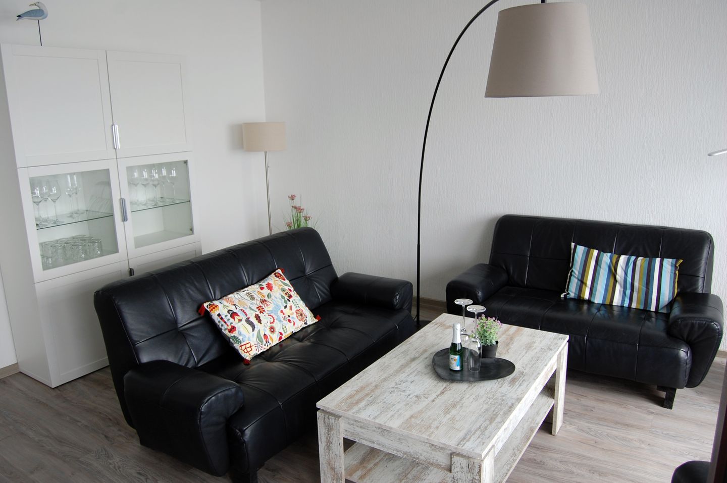 Das geräumige Wohnzimmer ist mit einer eleganten Ledercouch, einem bequemen Sessel, einem Flatscreen-Fernseher und einem Radio ausgestattet. Hier können Sie entspannen und den Blick auf das glitzernde Wasser genießen.