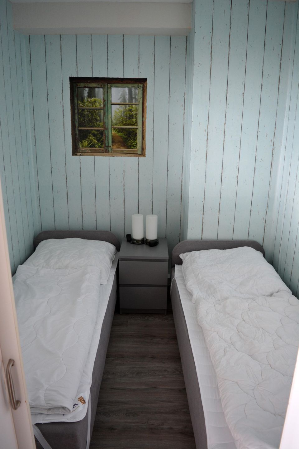 Das Kinderzimmer ist mit zwei einzelnen Boxspringbetten eingerichtet und verfügt über ein Fenster zur Küche hin sowie eine Schiebetür für Privatsphäre.
