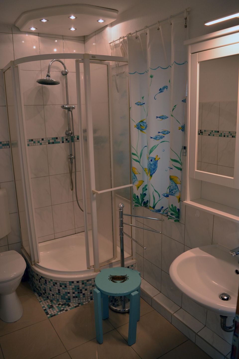 Das Badezimmer ist hell gefliest und verfügt über eine Dusche und WC, damit Sie sich nach einem Tag am Strand erfrischen können.