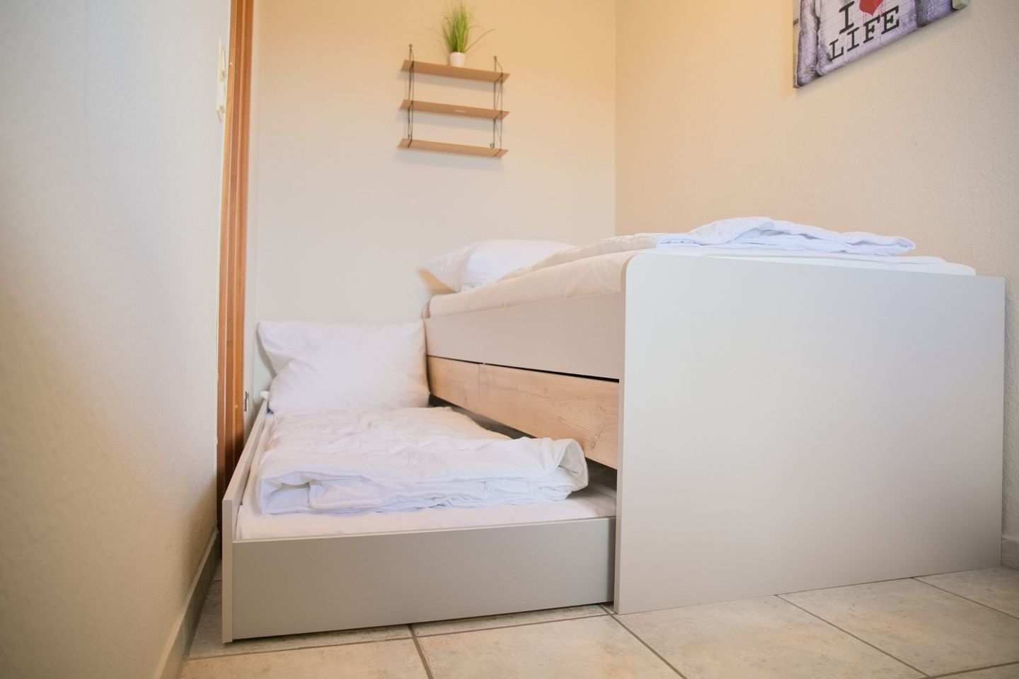 Die zwei Zimmer der Ferienwohnung sind geschmackvoll gestaltet und bieten Ihnen gemütliche Rückzugsorte für erholsame Nächte. Das Hauptschlafzimmer verfügt über ein komfortables Doppelbett (180x200 cm, durchgehender Topper) und für Ihre Urlaubsgarderobe finden Sie ausreichend Platz in dem Kleiderschrank auf dem Flur. Das zweite Zimmer ist eingerichtet mit einem Einzelbett (90x200 cm) und bieten ausreichend Platz für Ihre Familie oder Freunde. Das Einzelbett kann bei Bedarf noch einen weiteren Schlafplatz bieten, dieser ist beengt (70x200 cm).